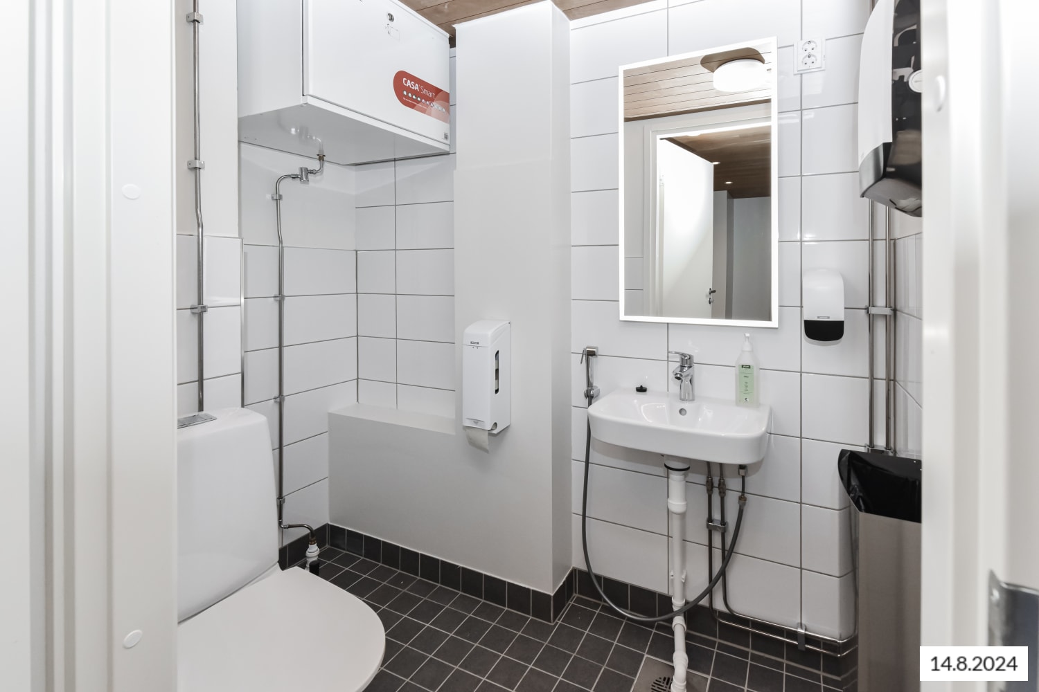 The bathroom floors are done in grey 10x10 cm tile with a textured look, the walls in large white tile and the ceilings in white-painted wood. The bathrooms come with Finnish, durable and easy-care Kide range furniture, and some of the bathrooms are also equipped with a laundry cabinet. The bathrooms have space and hook-ups for a washing machine. The wet rooms have electrical underfloor heating.