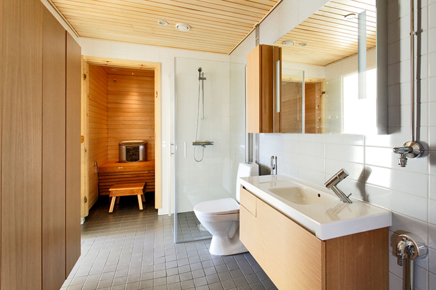 The tiled bathroom boasts comfort underfloor heating, sleek storage cabinets with a handy opening mechanism, Idon Seven water fixtures, and Alessi taps. The sauna benches are made of aspen.