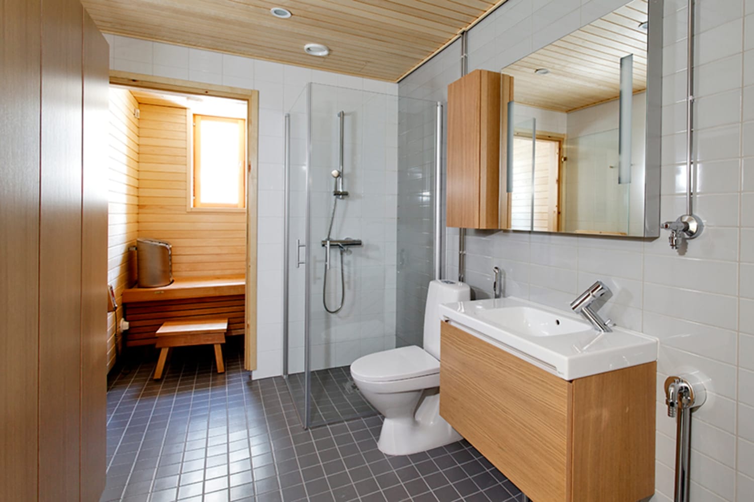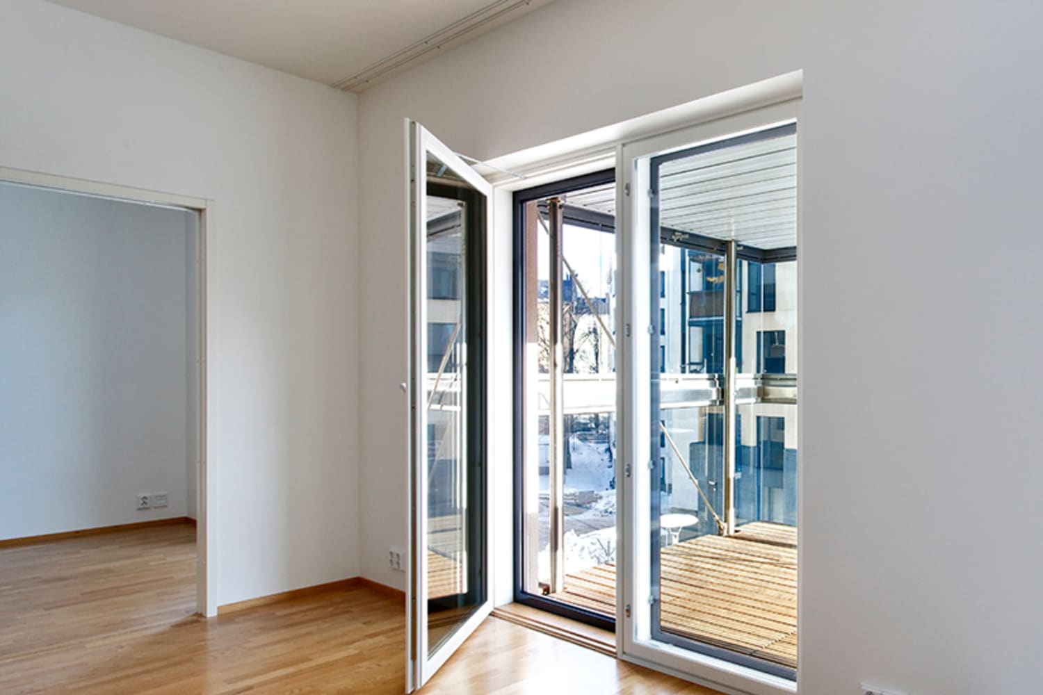 The units are done in three different colour schemes ranging from clean white to warm brown and edgy terracotta. The floors are parquet, with tiling in the kitchens and hallways. The bathrooms are also tiled and most of the units feature a private sauna. The storage solutions in all units are truly elegant and roomy. The balconies are glassed in and for the time being, the inner courtyard-facing units offer spectacular views of the sea (once the entire block is completed, the inner courtyard will provide a haven of peace in a busy city).