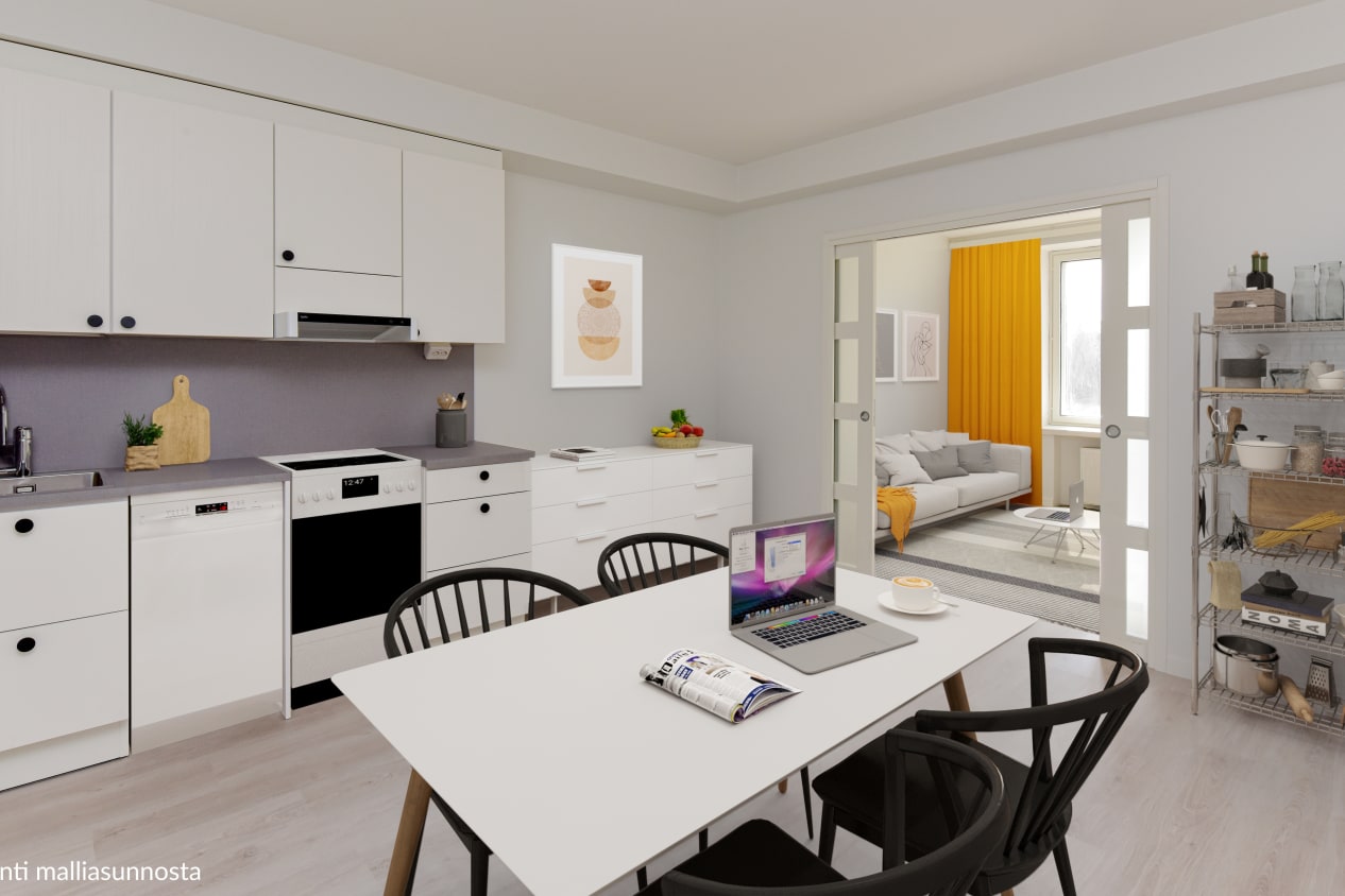 This 1930s building located on the shore of Siltavuorensalmi right by Hakaniementori-square has been reconstructed and the apartments have been renovated to a new level. The house has 41 apartments from efficient studios to 1 bedroom -apartments. Surface materials are timelessly light-colored and the sturdy windowsills exude the atmosphere of an old house. The floorplans of the apartments are clear and versatile. The kitchens open into living spaces that are easy to furnish. The floors are bleached oak plank laminate and the walls are white. The kitchen has white cabinets and the space between the upper and lower cabinets and the worktop are laminate with a grayscale pattern. The kitchens are equipped with a ceramic cooker, hob, fridge-freezer and dishwasher. The household appliances are white. The bathroom has white furniture from SATO's Kide collection and a place for a washing machine. The bathroom walls are white tile and the floor is gray. In the basement of the house there is a laundry room and drying room shared by the residents.