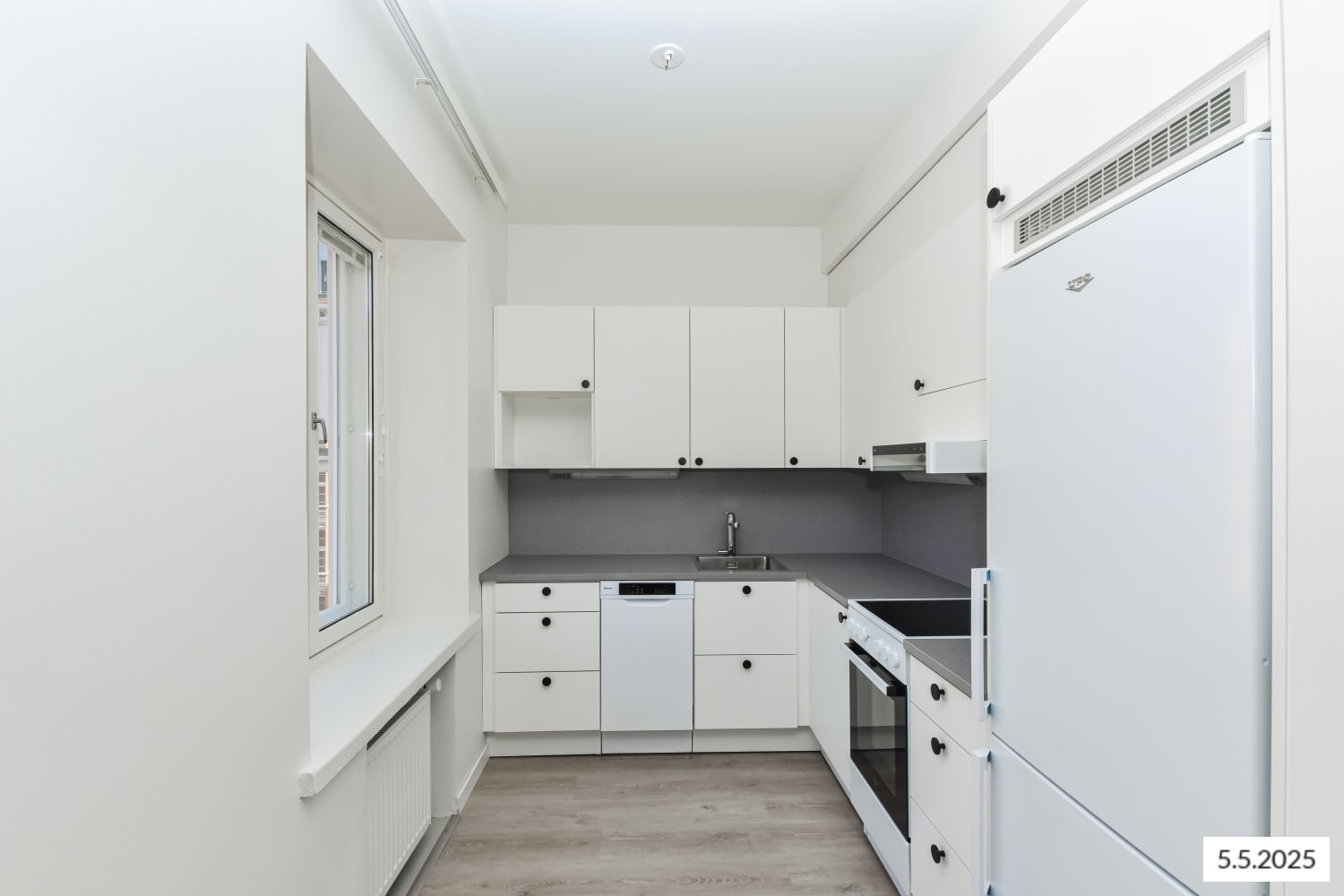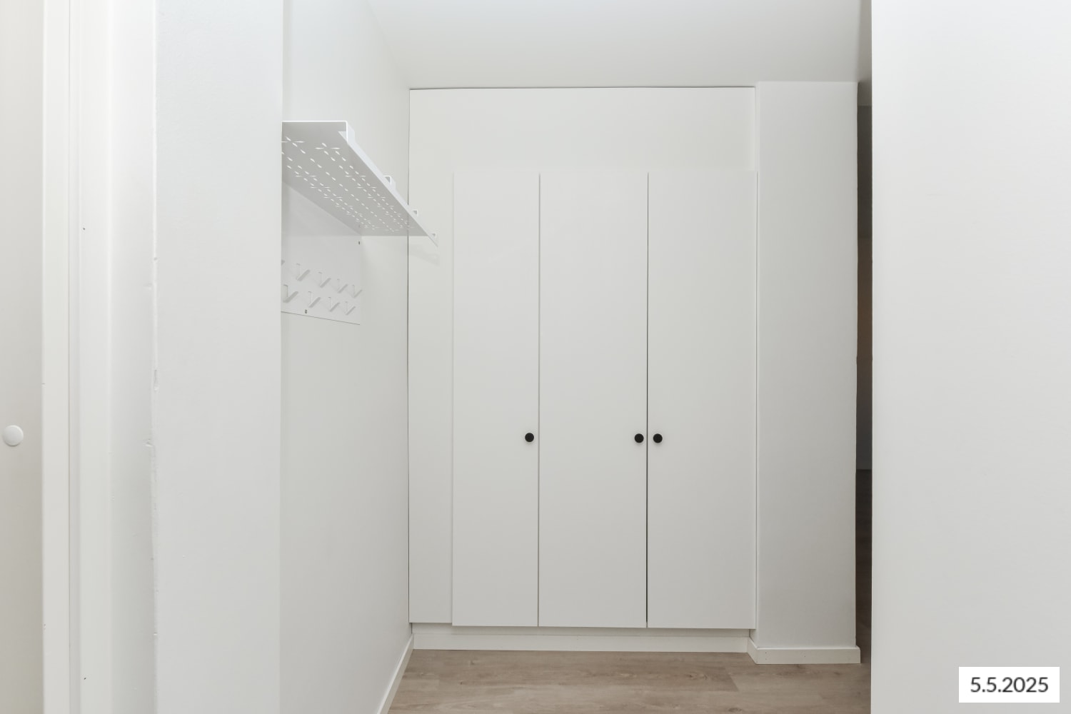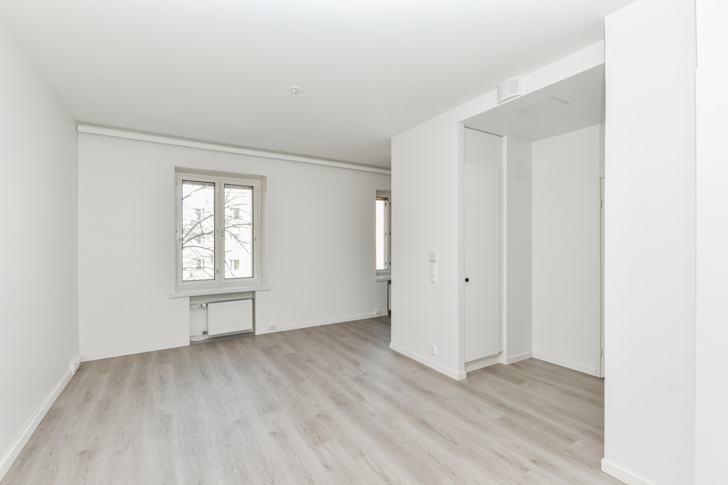 This beautifully renovated studio apartment from 2021 offers views towards the inner courtyard of the block. The double-pane windows and sturdy window sills are reminiscent of the bygone era of the functionalist building. The modern kitchen and living room merge into a bright living area that you can easily furnish to match your taste. The home's surface materials are light and timeless. The floor is bleached oak plank laminate and the walls are painted white.