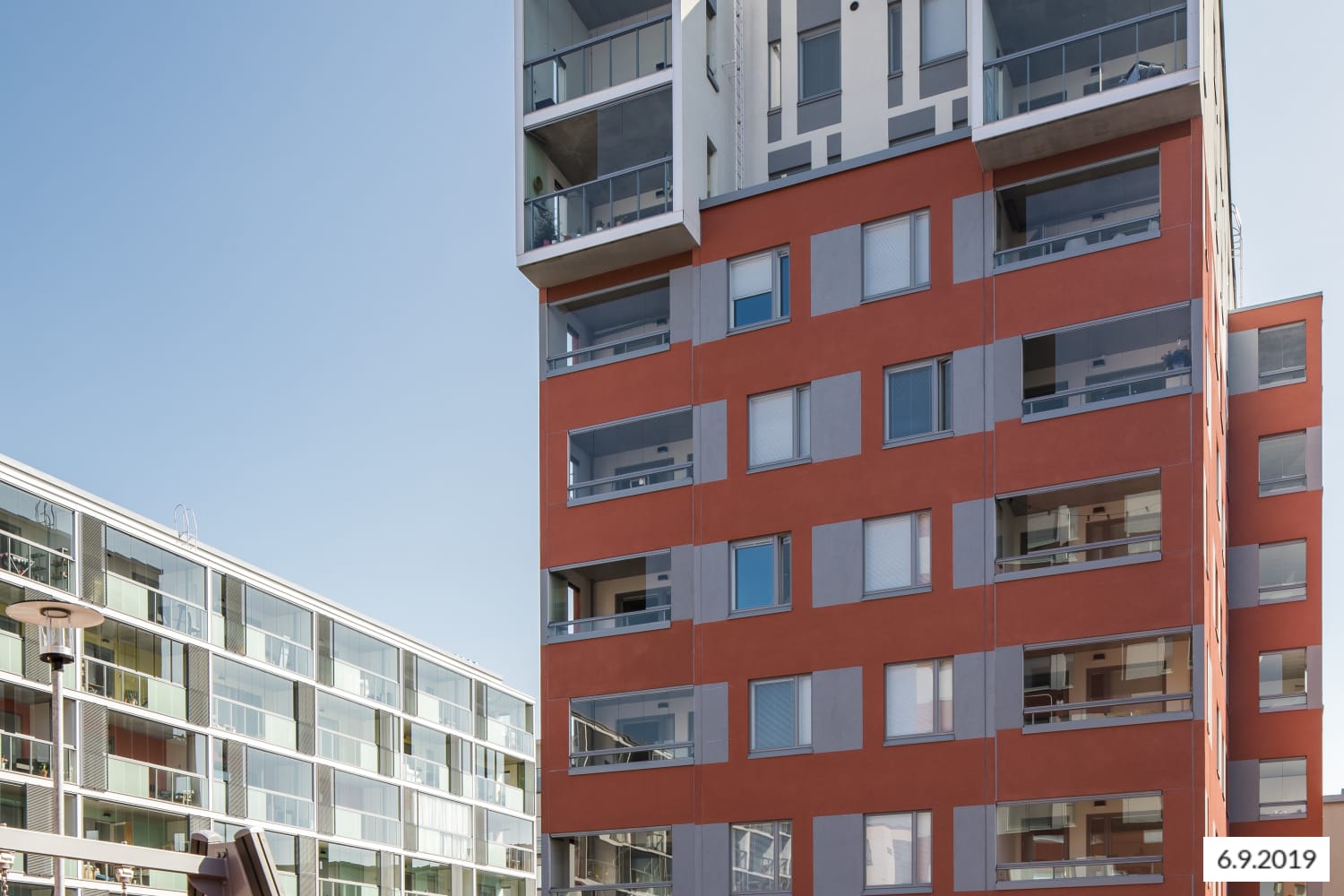 Residents also have access to a variety of shared facilities, including a club room, laundry room, drying room, sauna area, storage rooms, stroller storage, and equipment storage for outdoor gear. The property is connected to the district heating network, with heating provided through a water-circulating radiator system. Parking spaces are located in an underground garage beneath the courtyard deck and are available for rent depending on availability.