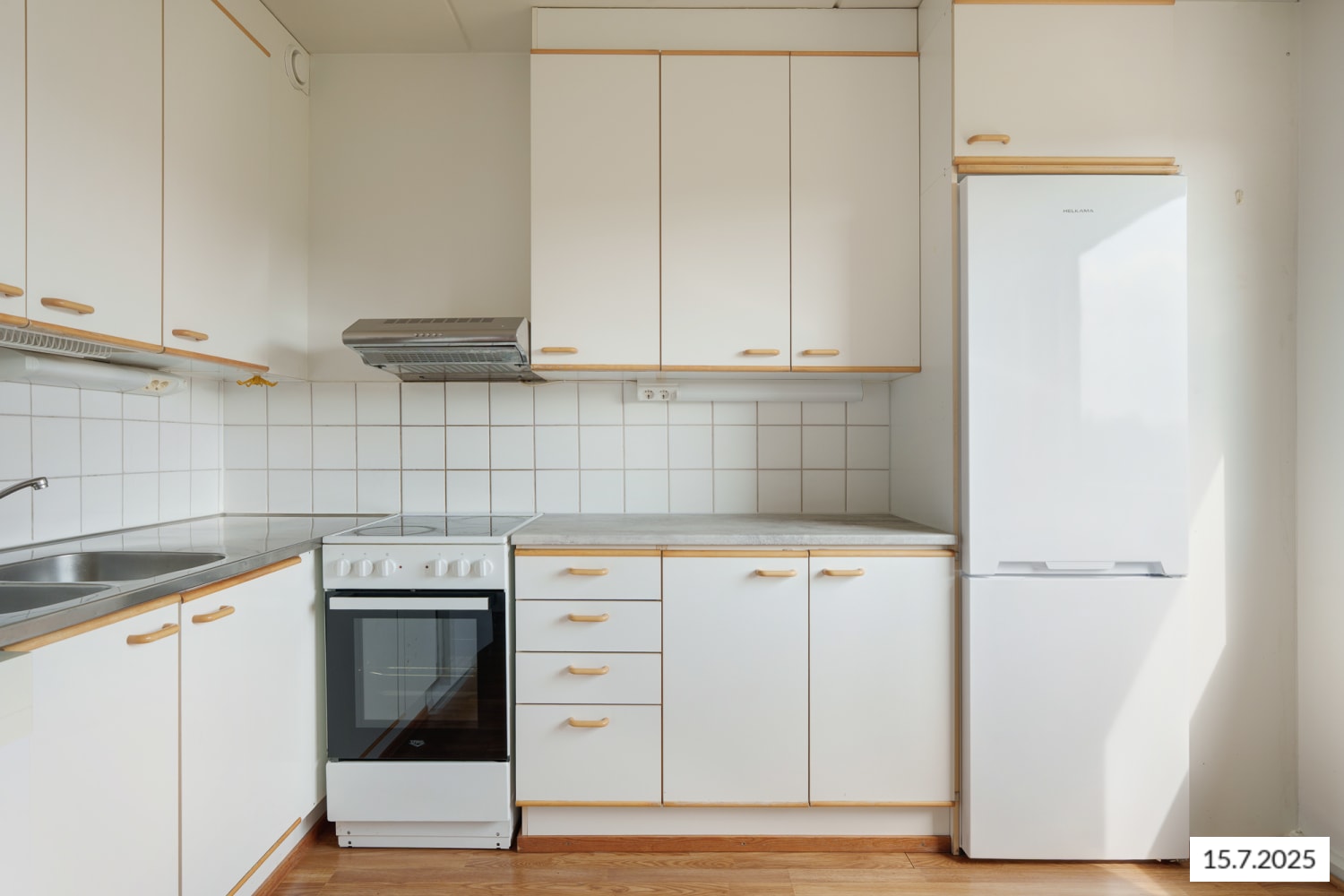 The separate kitchen can accommodate a proper dining table by the window. The kitchen cabinets are fresh white, the space between the upper and lower cabinets is tiled in white, and the countertop is white laminate. The equipment includes a dishwasher, ceramic hob, extractor hood, and freezer-refrigerator. The appliances are white.