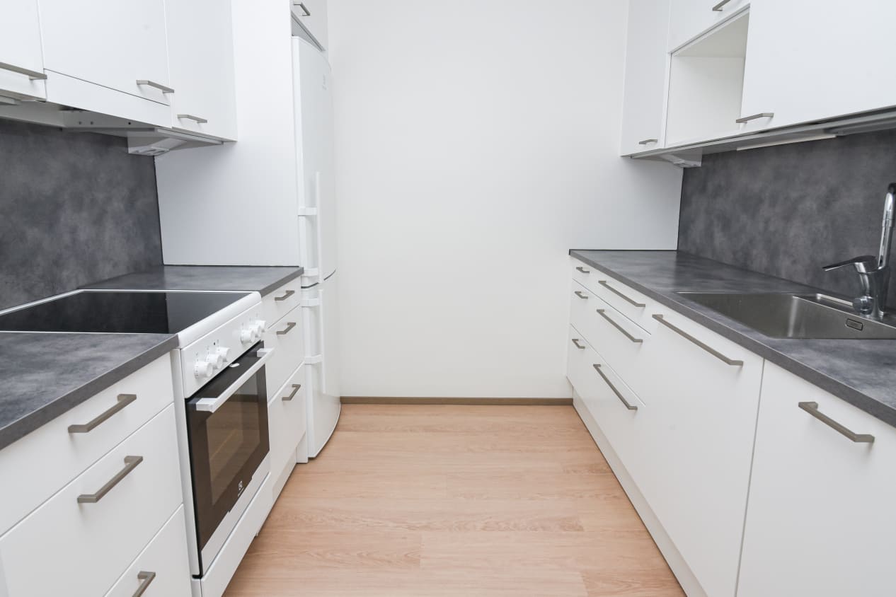 The kitchen cabinets are fresh white, with grey laminate between the upper and lower cabinets and on the countertops. The kitchen is equipped with a dishwasher, induction cooker, and freezer-refrigerator. All appliances are integrated into the cabinetry.