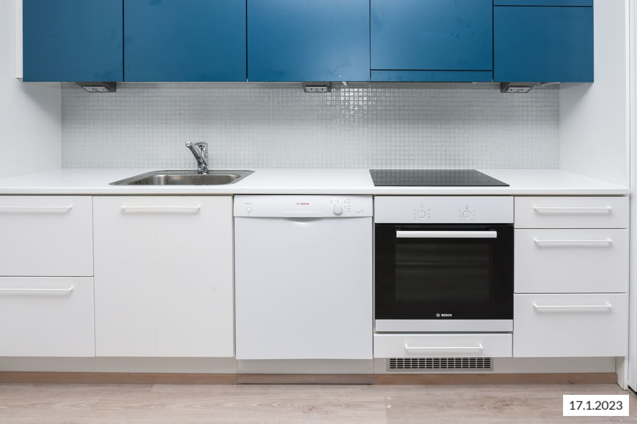 This modern home features laminate flooring. The kitchen lower cabinets and tall cabinets have white doors, while the upper cabinet doors and open shelves are petrol blue. The worktops are white laminate, and the space between the upper and lower cabinets is tiled with glass mosaic tiles. The kitchen is equipped with a ceramic hob, built-in oven, cooker hood, freezer-refrigerator, dishwasher, and space for a microwave. The appliances are white.