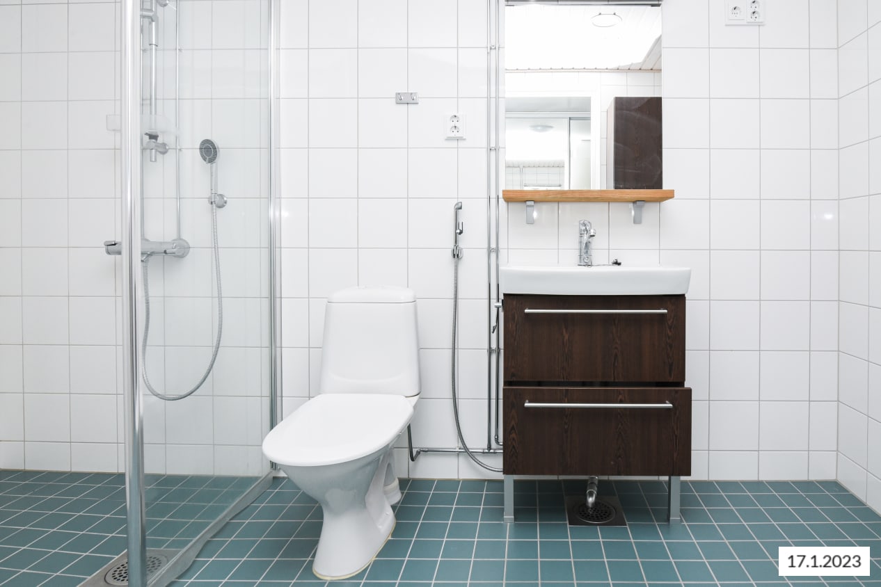 The tiled bathroom walls are glossy white, and the floors are petrol blue. The furnishings have a dark brown wood grain pattern. There is space allocated for a washing machine and tumble dryer.