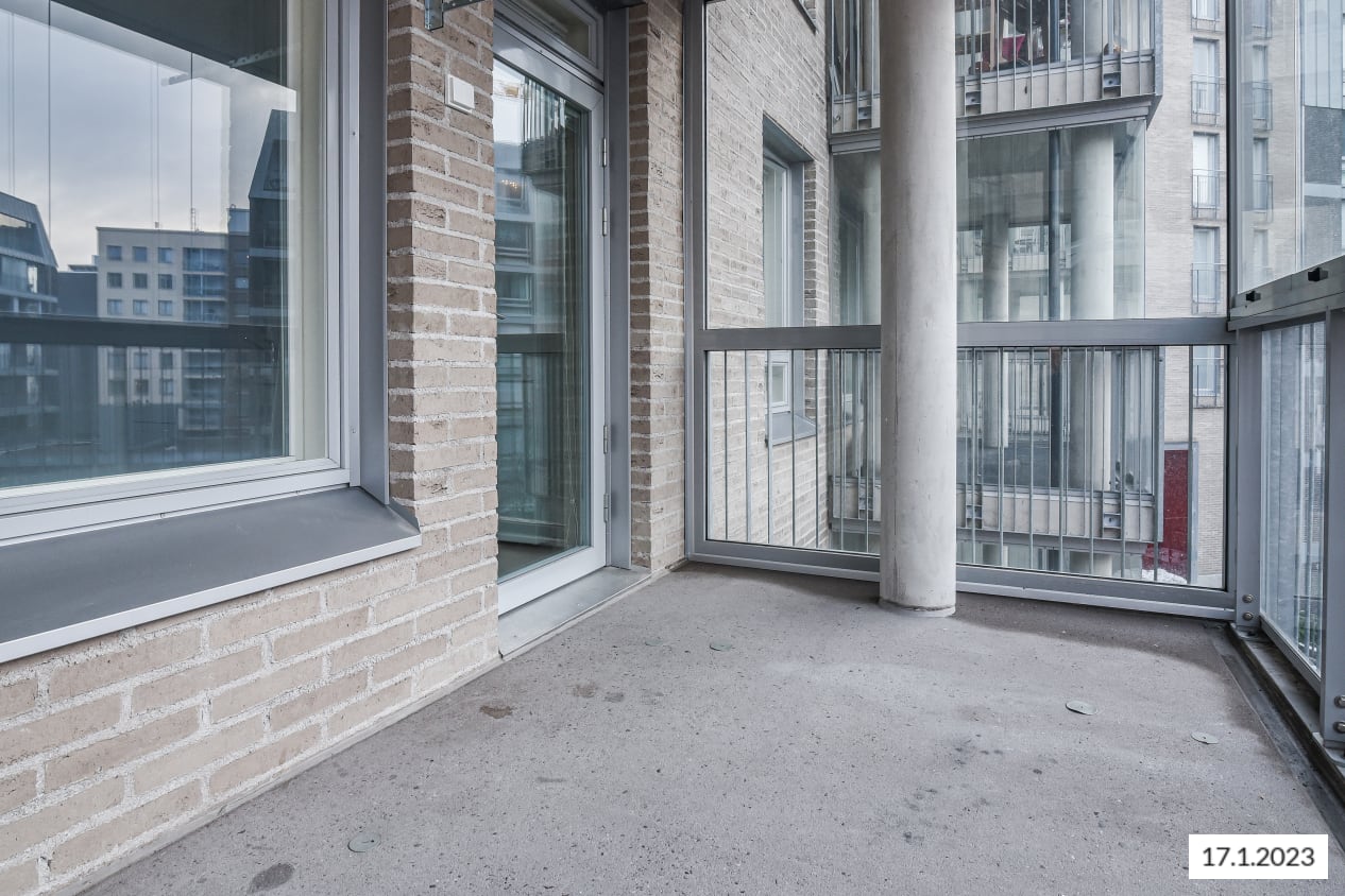 The living room and open kitchen in this well-designed one bedroom apartment form a unified, easily furnished lounge area. The bedroom is conveniently accessible from both sides of the bed, and the walk-in wardrobe offers plenty of storage space. The glazed balcony is a lovely spot to enjoy afternoon coffee.