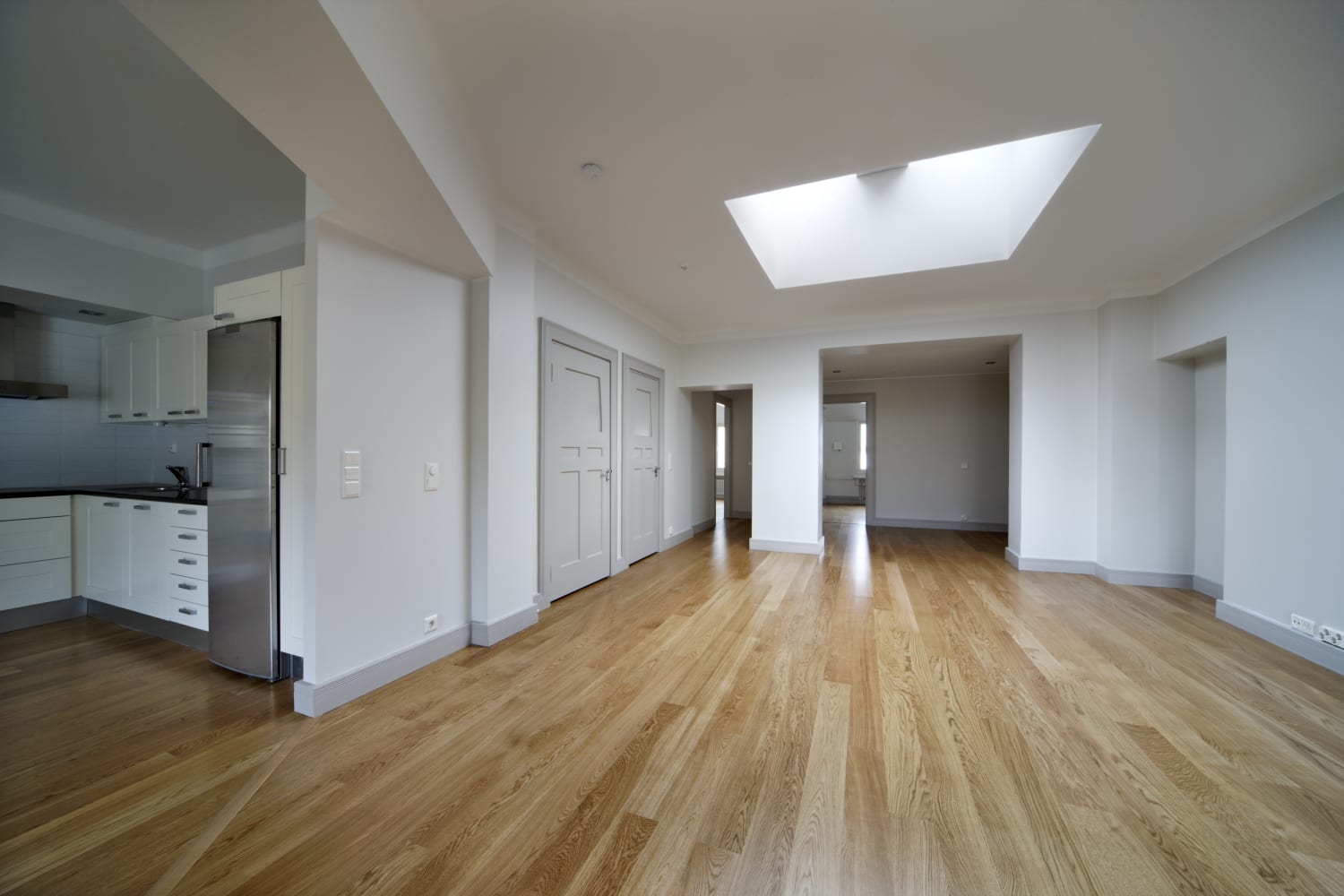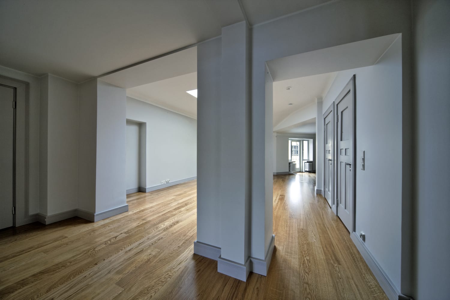 The rooms are floored in wide-slatted oak parquet. The tiled bathrooms feature underfloor comfort heating. The kitchens are appointed with understated cabinetry of Finnish manufacture, black granite countertops and Siemens appliances. Some of the units have lovely stone balconies facing the street, some have had new balconies built facing the inner courtyard.
