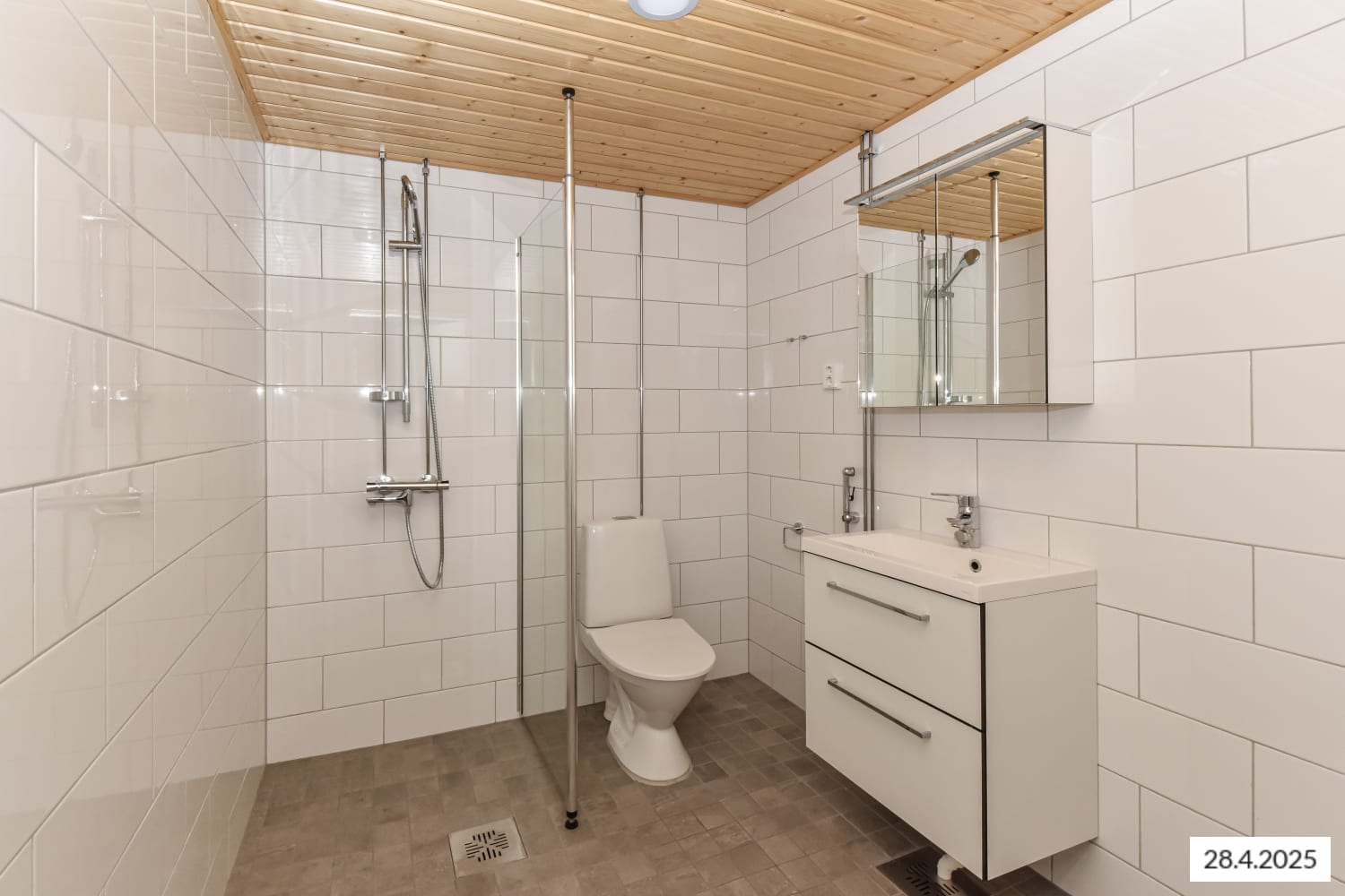 The apartment is equipped with a dishwasher, ceramic hob, and fridge-freezer. The bathroom features SATO’s sleek Kide collection furnishings, with white tiled walls and a grey tiled floor. There is a designated space for both a washing machine and a dryer.