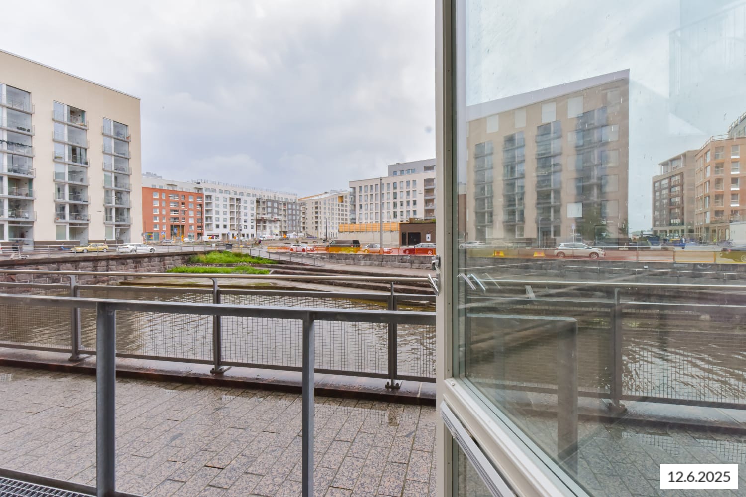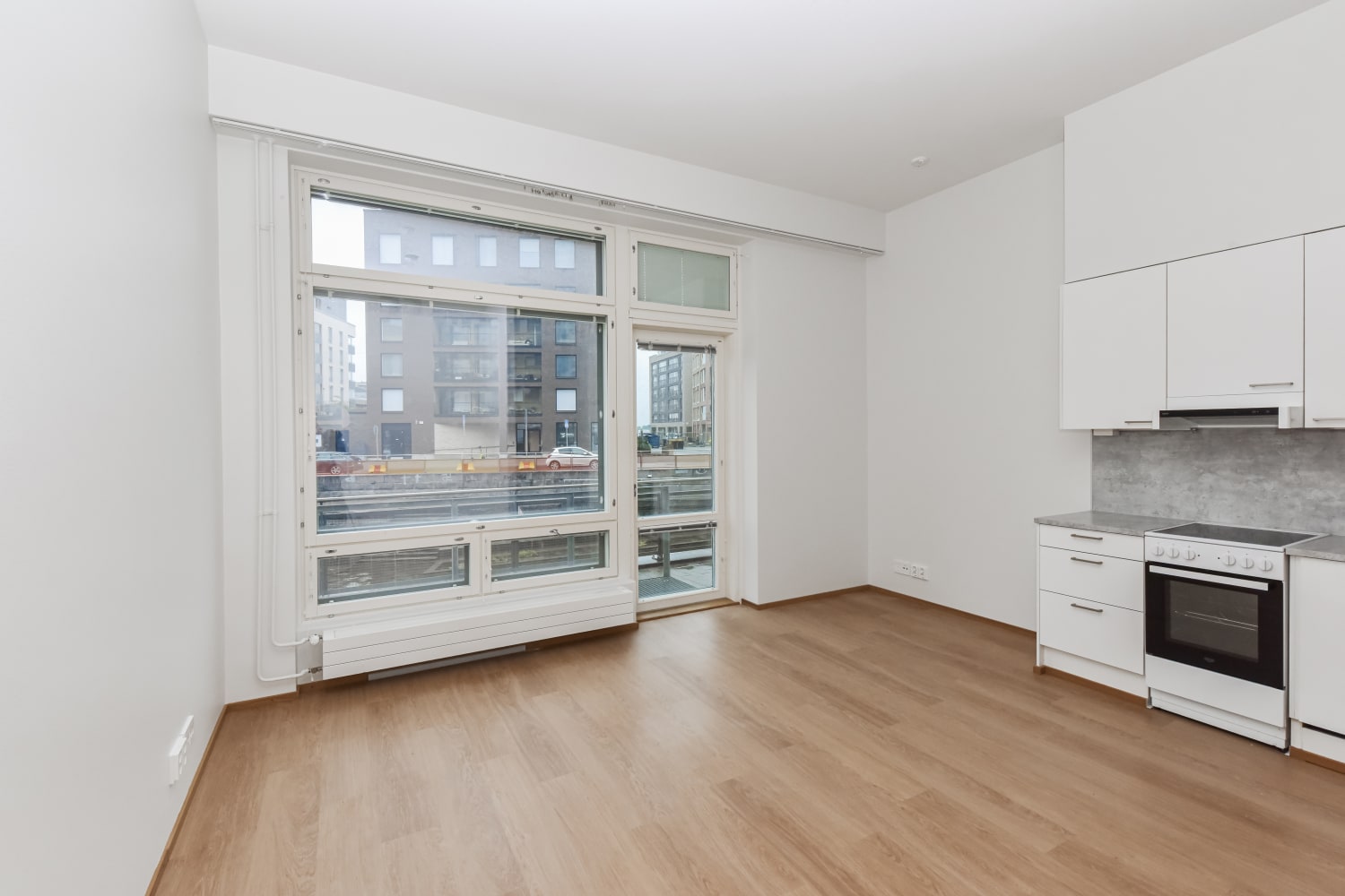 Fresh studio apartment charms with its open simplicity. You can easily furnish a cosy dining area next to the kitchen space, which can accommodate a dining table. The yard area facing Verkkosaari canal is perfect for a small potted garden. The entrance closets are white, and the windows come with ready-made blinds. The flooring is light oak laminate and the walls are painted white.