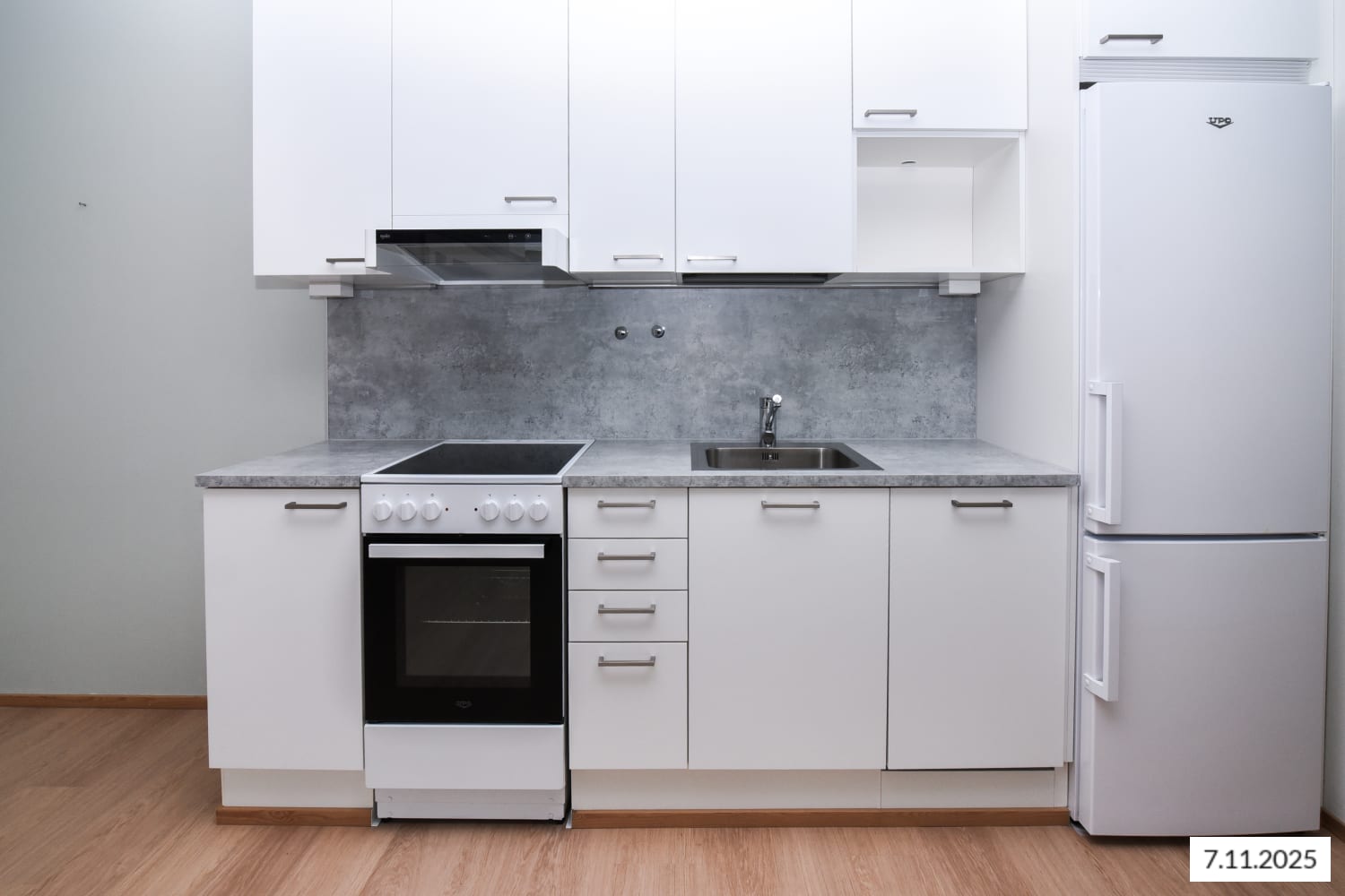 The kitchen cabinets are a fresh white, with grey laminate between the upper and lower cabinets and on the worktop. The equipment includes a dishwasher, ceramic stove, and freezer-refrigerator.