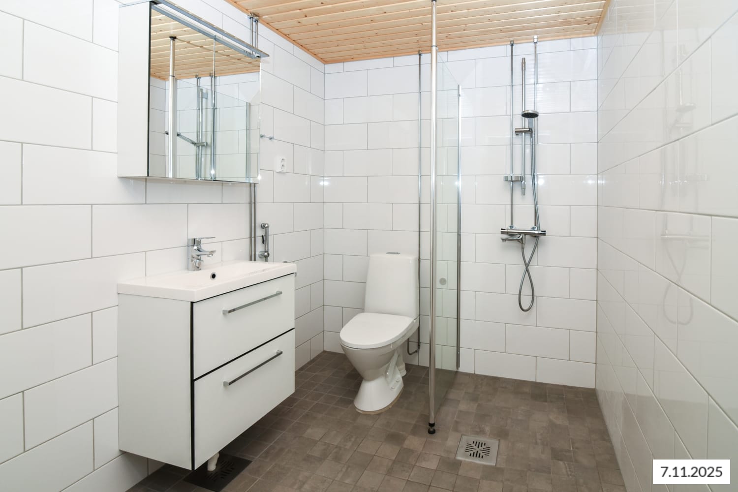 The bathroom features white domestic Kide collection fittings. The walls are white tiles and the floor is grey. There is space for a washing machine and a dryer.