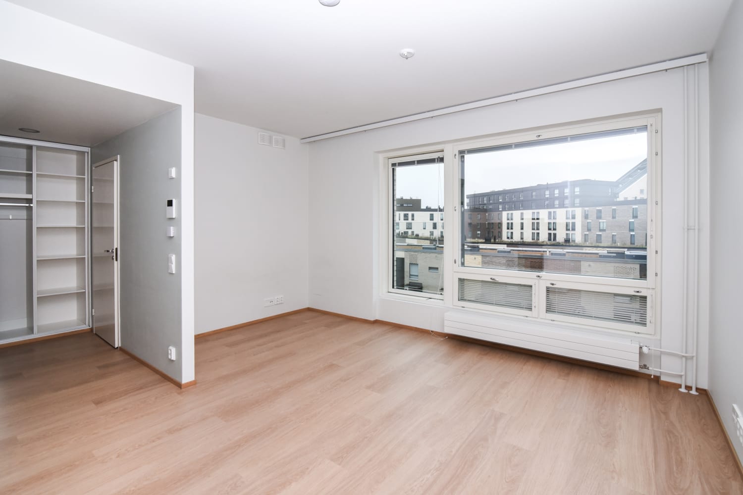 This modern studio apartment charms with its open clarity and easy-to-furnish layout, enhanced by a juliet balcony. The kitchen area accommodates a dining table. The hallway wardrobes are white and the windows are equipped with blinds. The flooring is light oak laminate and the walls are painted white.