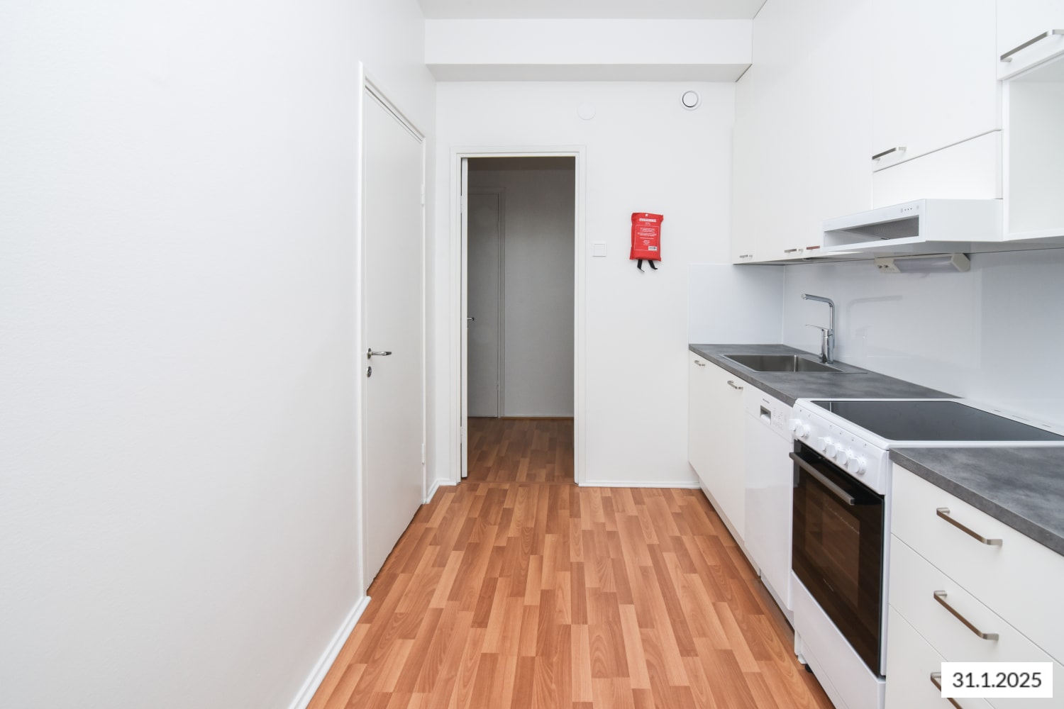 This serene urban home is located near Torkkelinmäki, with windows overlooking a small park. The cleverly designed living room with an alcove makes furnishing easier, and the kitchen comfortably accommodates a small dining table. The apartment’s windows offer views of both the street and the small park.