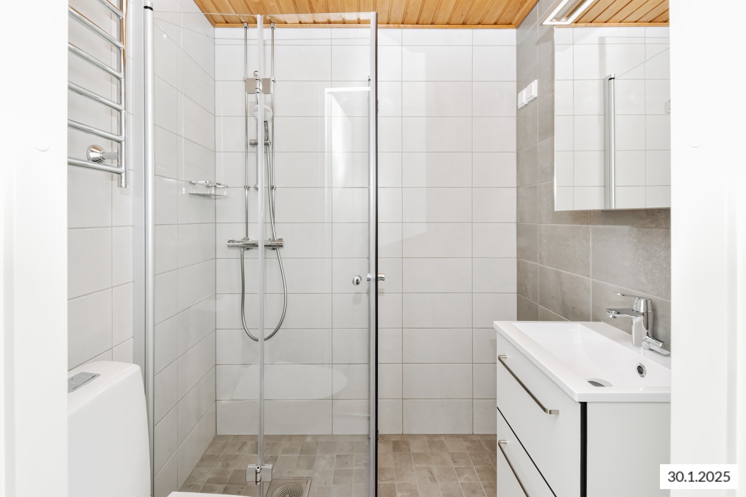 The bathroom, fully renovated in 2024, is tiled, and some bathrooms have space for a washing machine. The wall tiles are white, and the floor and accent tiles are grey, with ceilings made of alder wood. The fresh, light-toned kitchens are equipped with a ceramic induction hob, fridge-freezer, and dishwasher, with a dedicated space for a microwave. The renovated living room floors feature matte-finished oak-patterned laminate. Some floors were not updated during the refurbishment. Storage rooms are available in both the basement and the attic. The building also features a storage room for outdoor equipment, a laundry room, and a drying room. The property is fitted with a mechanical supply and exhaust ventilation system and an intercom system.