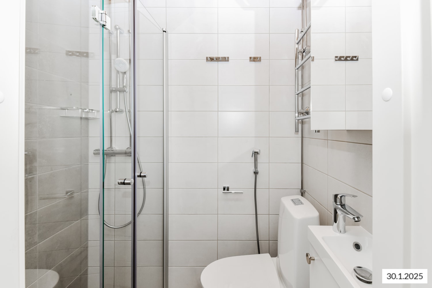 The bathroom, fully renovated in 2024, is tiled, and some bathrooms have space for a washing machine. The wall tiles are white, and the floor and accent tiles are grey, with ceilings made of alder wood. The fresh, light-toned kitchens are equipped with a ceramic induction hob, fridge-freezer, and dishwasher, with a dedicated space for a microwave. The renovated living room floors feature matte-finished oak-patterned laminate. Some floors were not updated during the refurbishment. Storage rooms are available in both the basement and the attic. The building also features a storage room for outdoor equipment, a laundry room, and a drying room. The property is fitted with a mechanical supply and exhaust ventilation system and an intercom system.