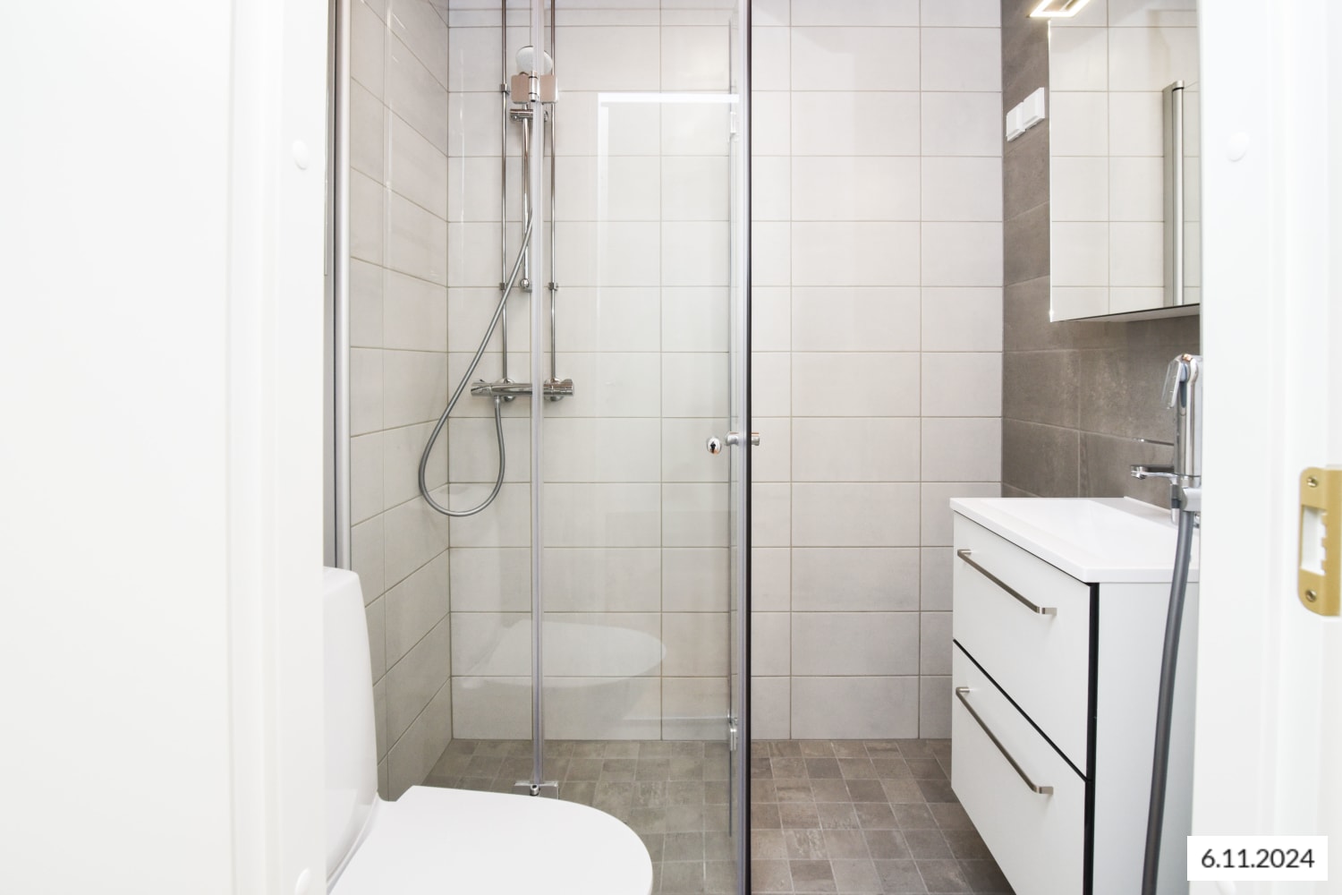 The bathroom, fully renovated in 2024, is tiled, and some bathrooms have space for a washing machine. The wall tiles are white, and the floor and accent tiles are grey, with ceilings made of alder wood. The fresh, light-toned kitchens are equipped with a ceramic induction hob, fridge-freezer, and dishwasher, with a dedicated space for a microwave. The renovated living room floors feature matte-finished oak-patterned laminate. Some floors were not updated during the refurbishment. Storage rooms are available in both the basement and the attic. The building also features a storage room for outdoor equipment, a laundry room, and a drying room. The property is fitted with a mechanical supply and exhaust ventilation system and an intercom system.