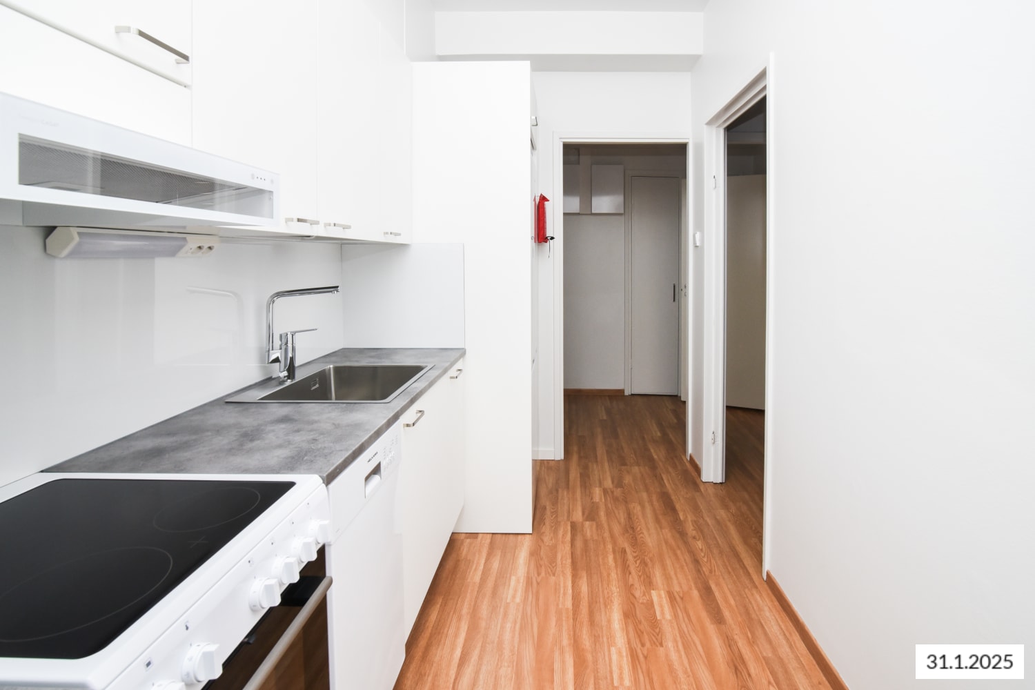This serene urban home is located near Torkkelinmäki, with windows overlooking a small park. The cleverly designed living room with an alcove makes furnishing easy, and the kitchen has enough space for a small dining table. The apartment’s windows offer views of both the street and the park.
