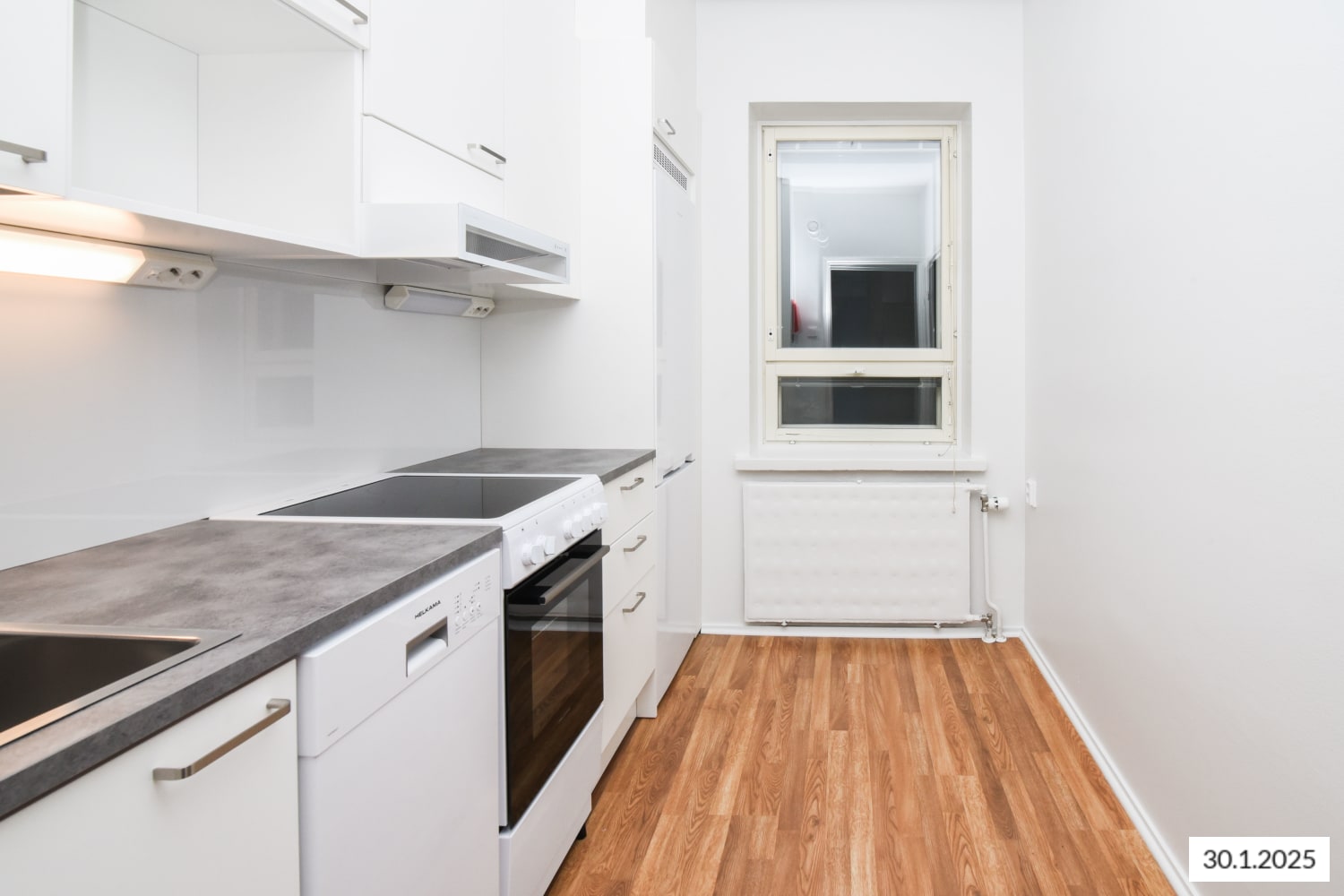 In the heart of Kallio, on the edge of Torkkelinmäki, awaits a cosy and well-kept studio for its new resident. The efficient layout features a living room with an alcove and a compact kitchen, which was fully renovated during the major refurbishment in 2024. The apartment’s windows face the inner courtyard.