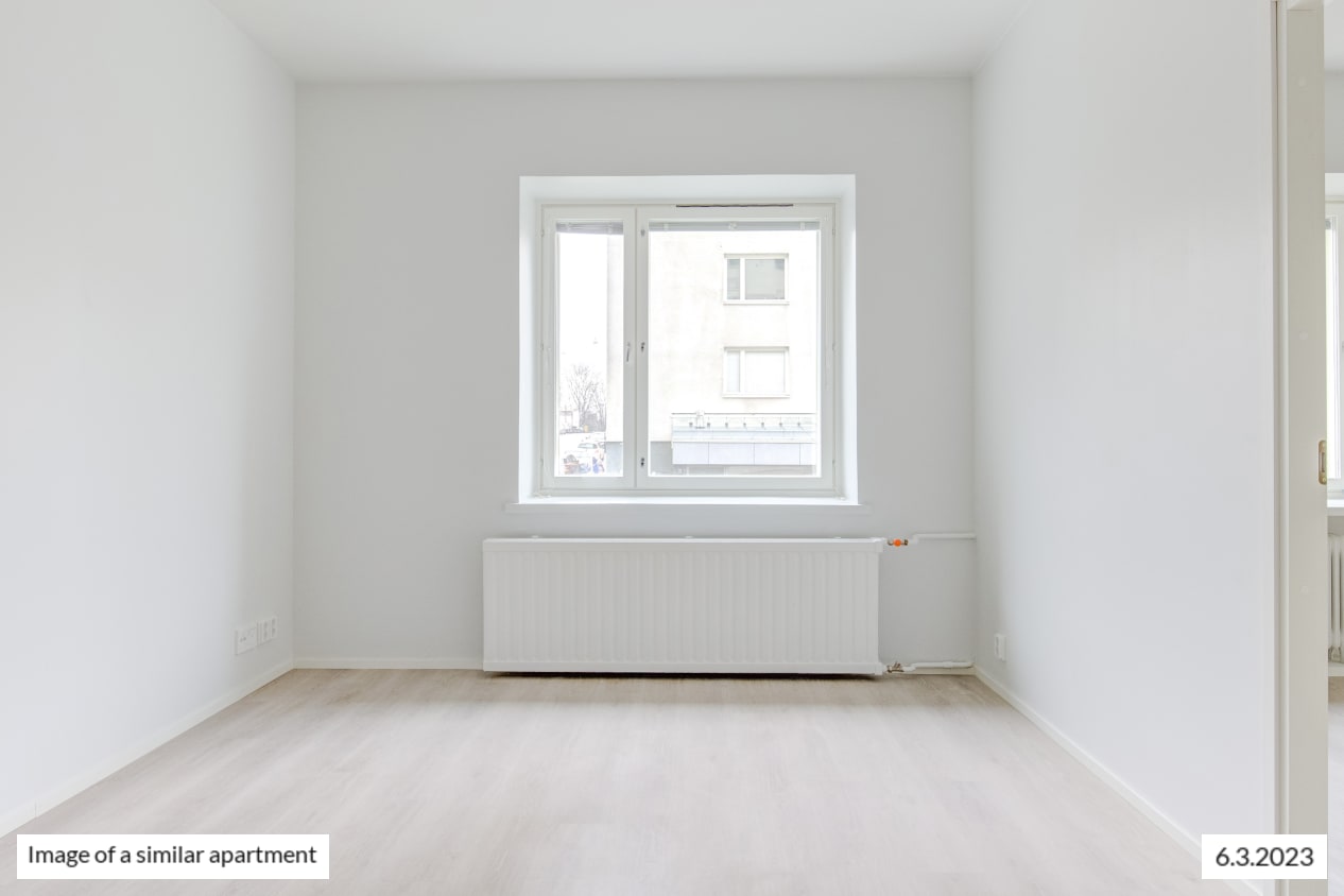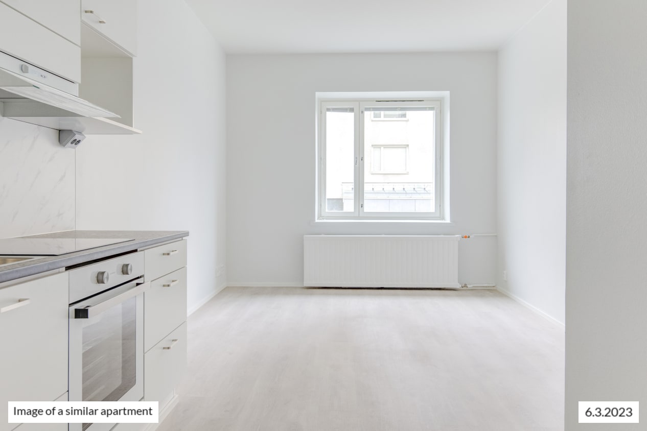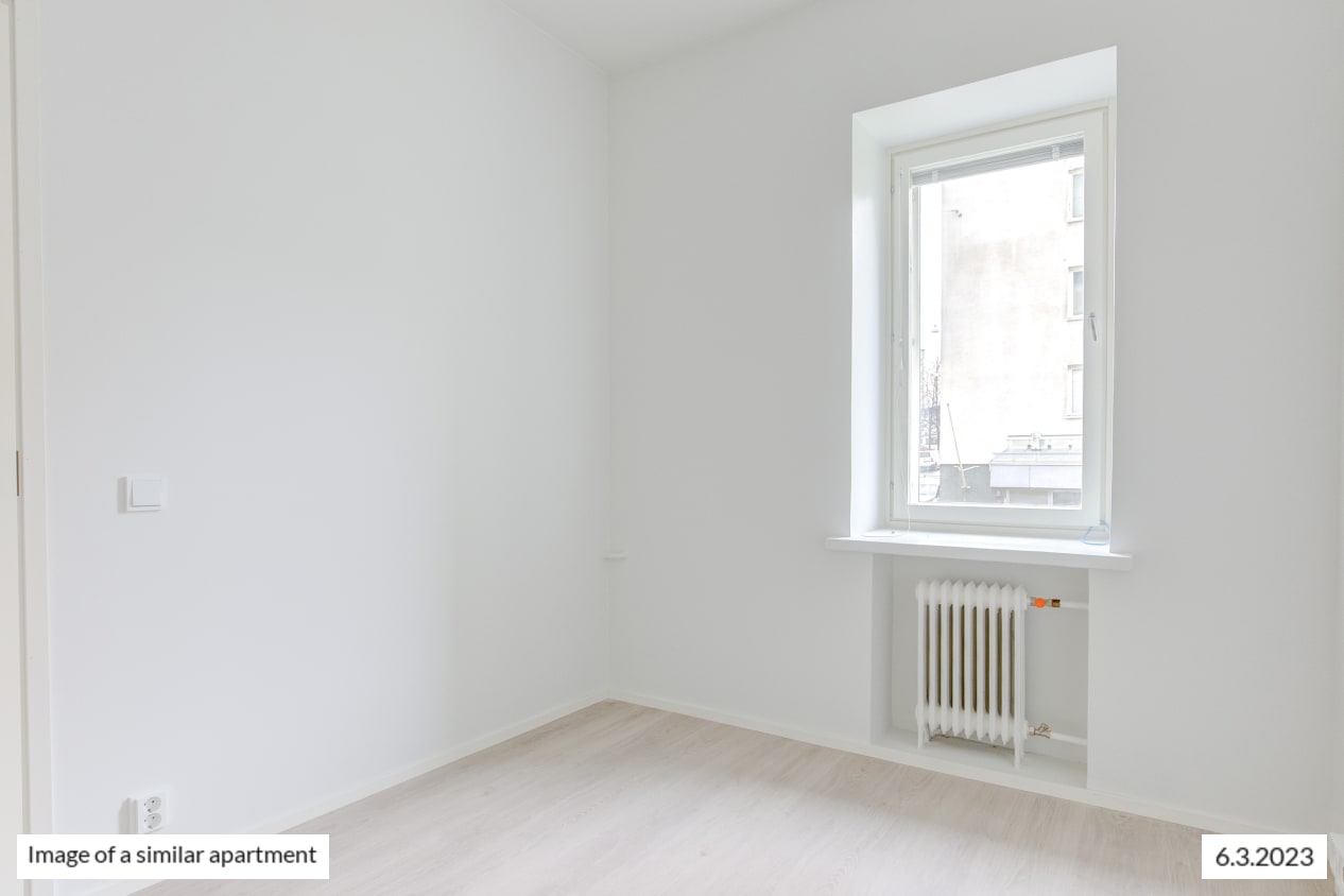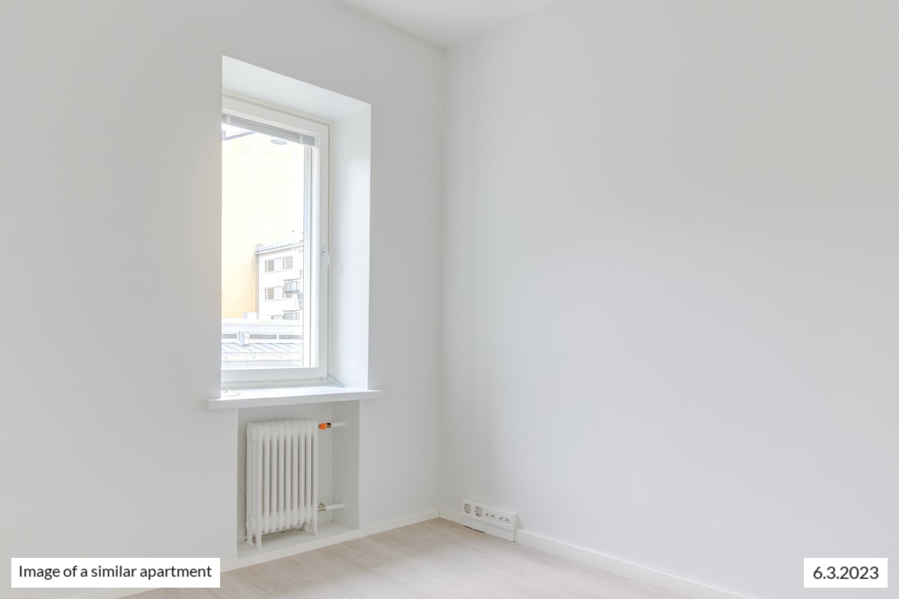 The windows of the light-filled and spacious apartment face northwest to Castréninkatu street. And the view is fantastic! There is a nice amount of storage space: a long row of wardrobes in the bedroom and added storage in the entrance hallway. The functional kitchen is conveniently slightly separate from the living room yet forming a nice combined space.