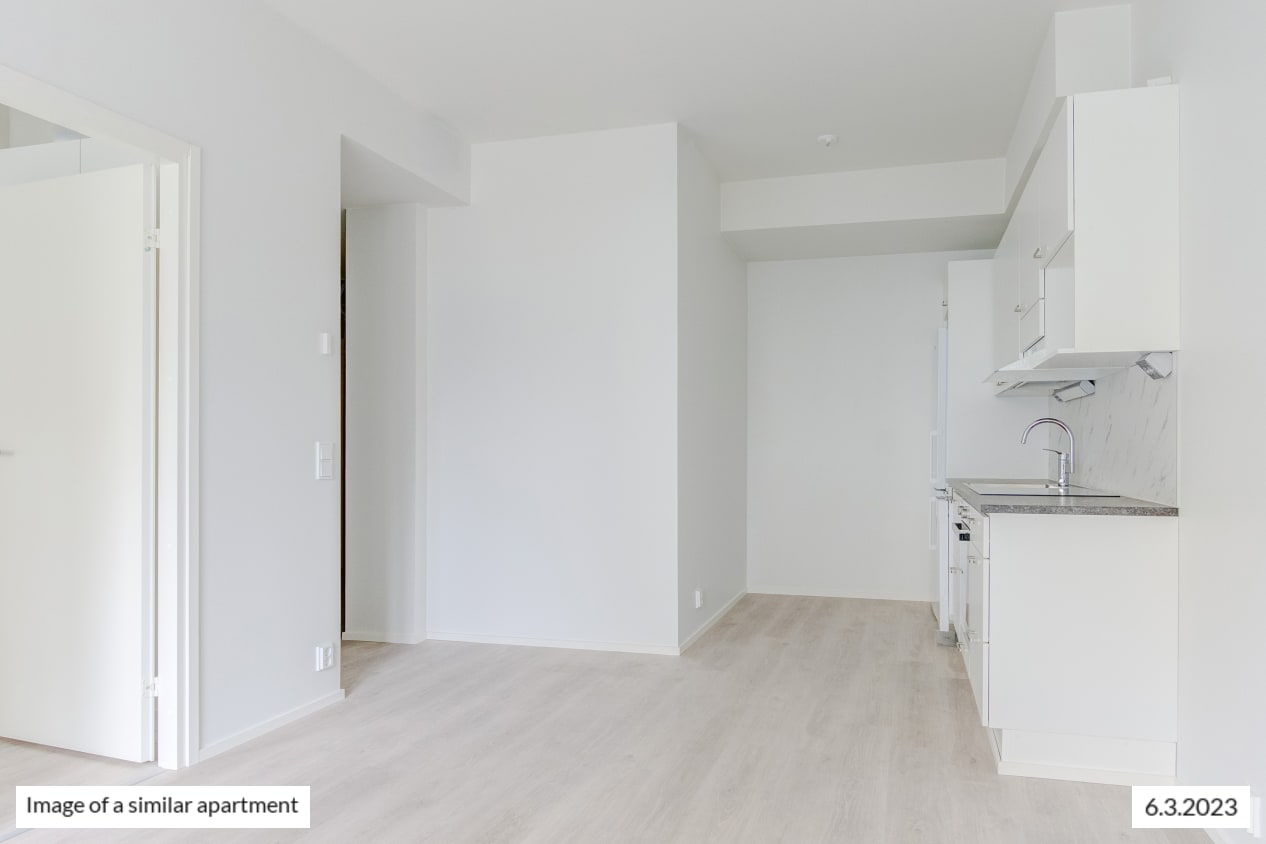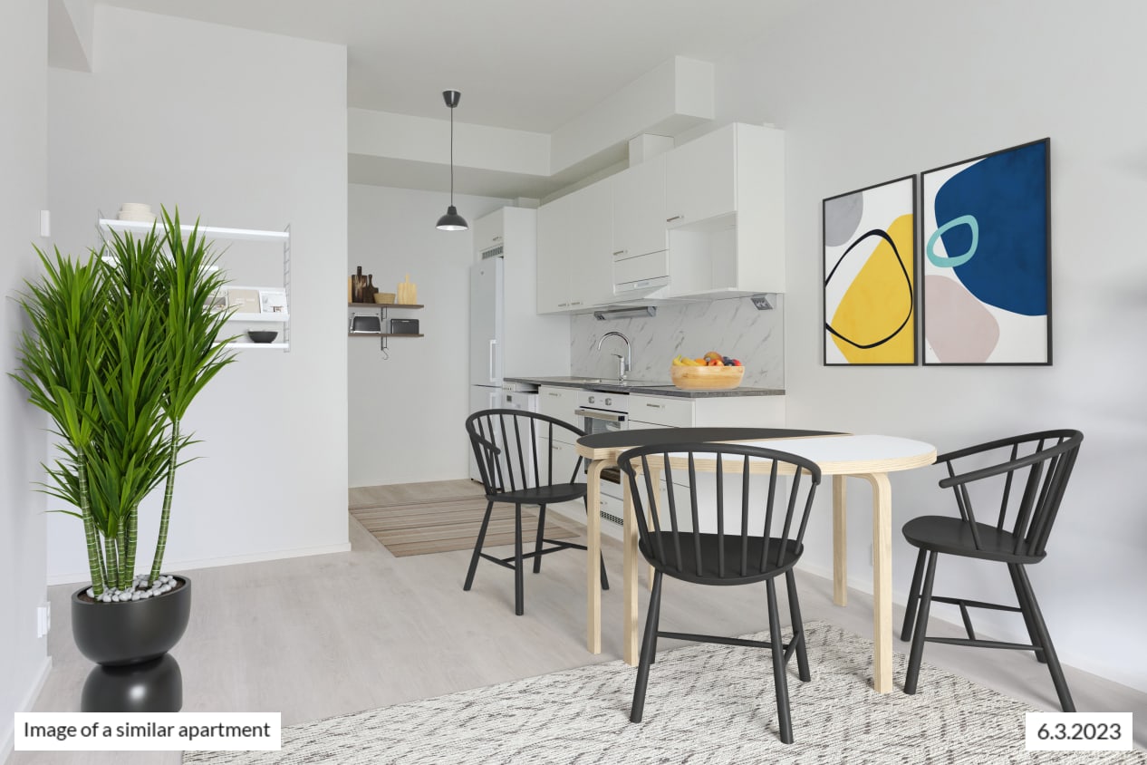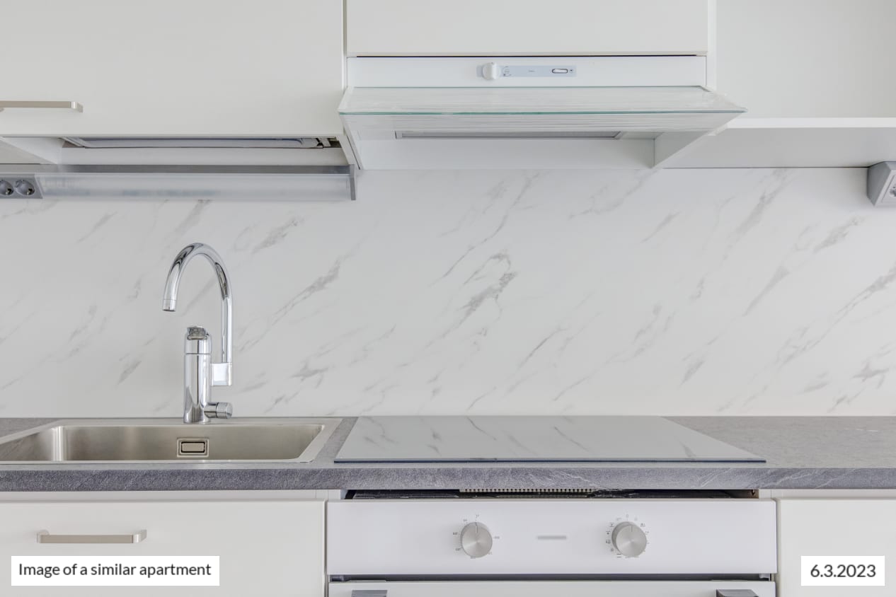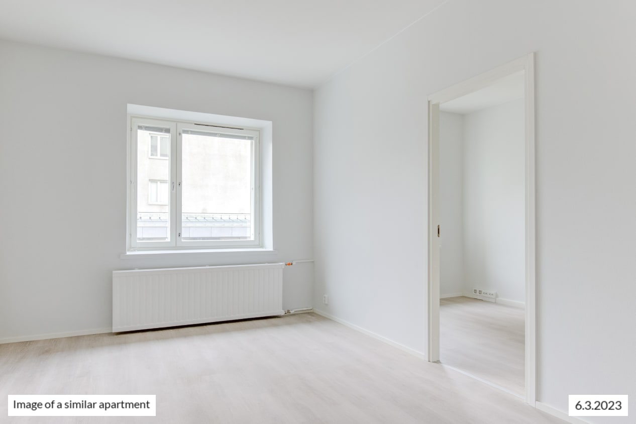 The windows of the light-filled and spacious apartment face northwest to Castréninkatu street. And the view is fantastic! There is a nice amount of storage space: a long row of wardrobes in the bedroom and added storage in the entrance hallway. The functional kitchen is conveniently slightly separate from the living room yet forming a nice combined space.