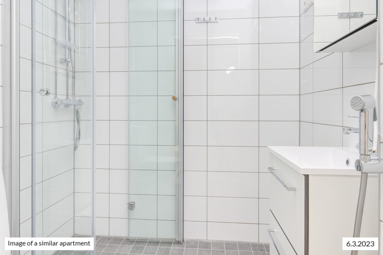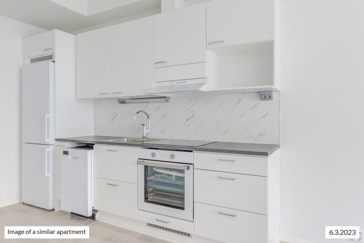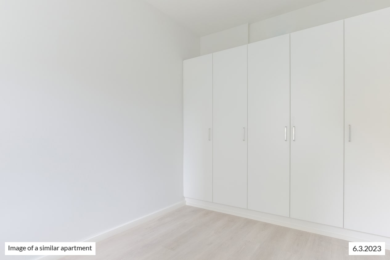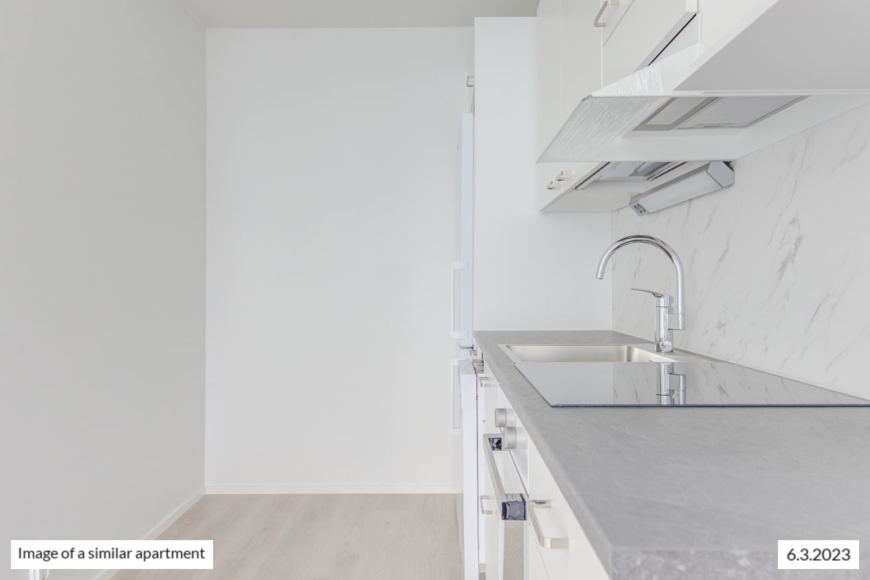 The windows of the light-filled and spacious apartment face northwest to Castréninkatu street. And the view is fantastic! There is a nice amount of storage space: a long row of wardrobes in the bedroom and added storage in the entrance hallway. The functional kitchen is conveniently slightly separate from the living room yet forming a nice combined space.