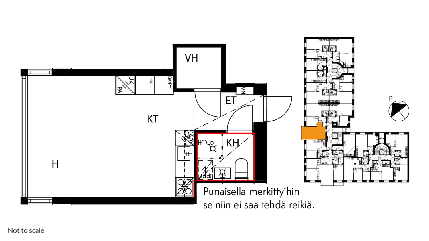 The apartment features fabulous wide bay windows offering a big city view to the northeast overlooking Castréninkatu street. There is space for clothes and leisure gear in the spacious closet accessed from the entrance hallway. The functional kitchen has everything you need within your reach: there is room here to cook for a larger crowd, too. Thanks to the smart layout, the lounging area is easy to furnish in many different ways.