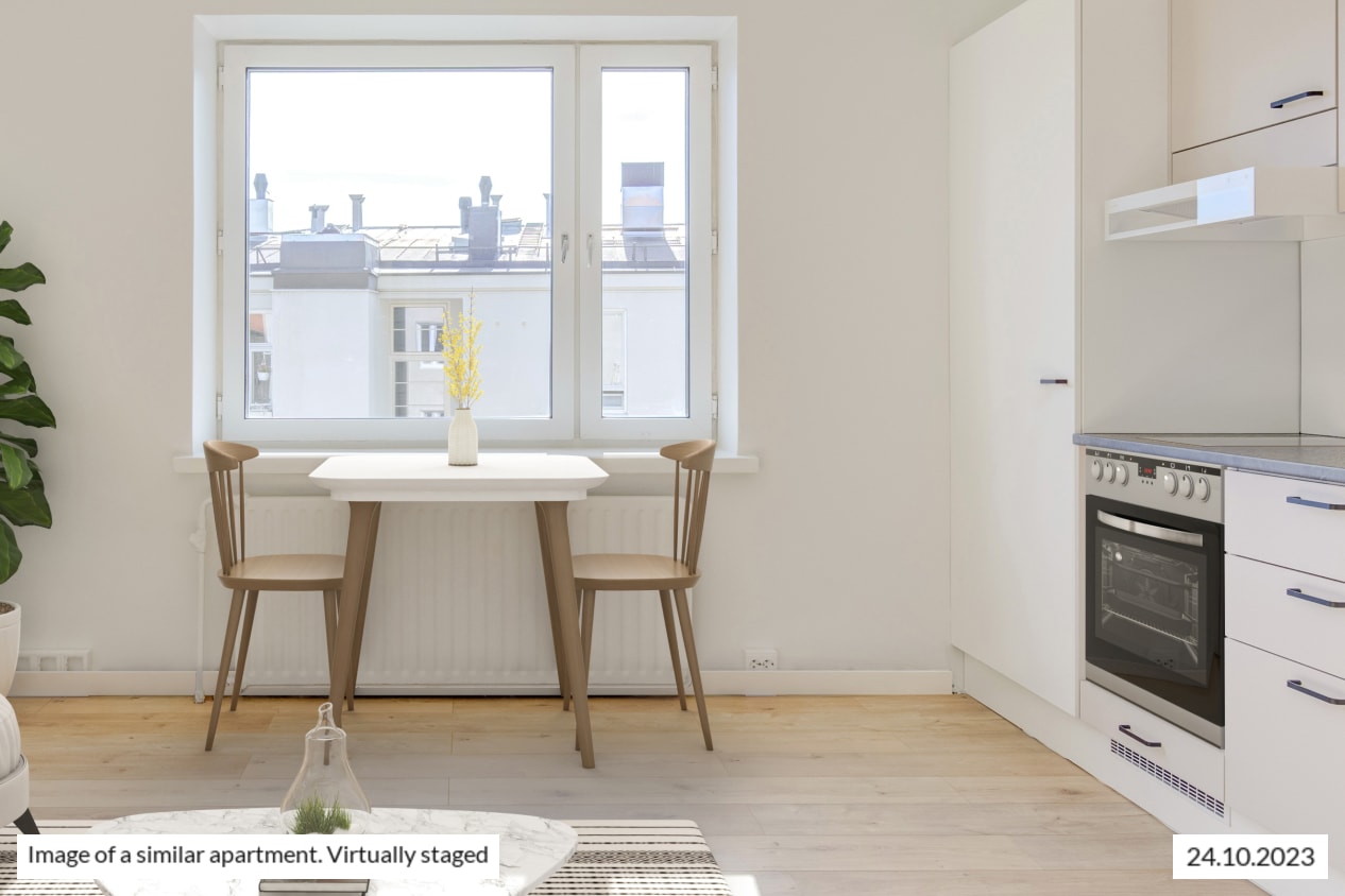 This functional studio home has everything you need and open southwest-facing views towards Hakaniemi. The kitchen space is combined seamlessly with the living area that is easy to furnish just the way you like it. And what would you set on display on the deep, 1950’s windowsills? There is storage space in the entrance hallway as well as the main room. Please notice, that in this apartment the hallway is only 83 cm wide.