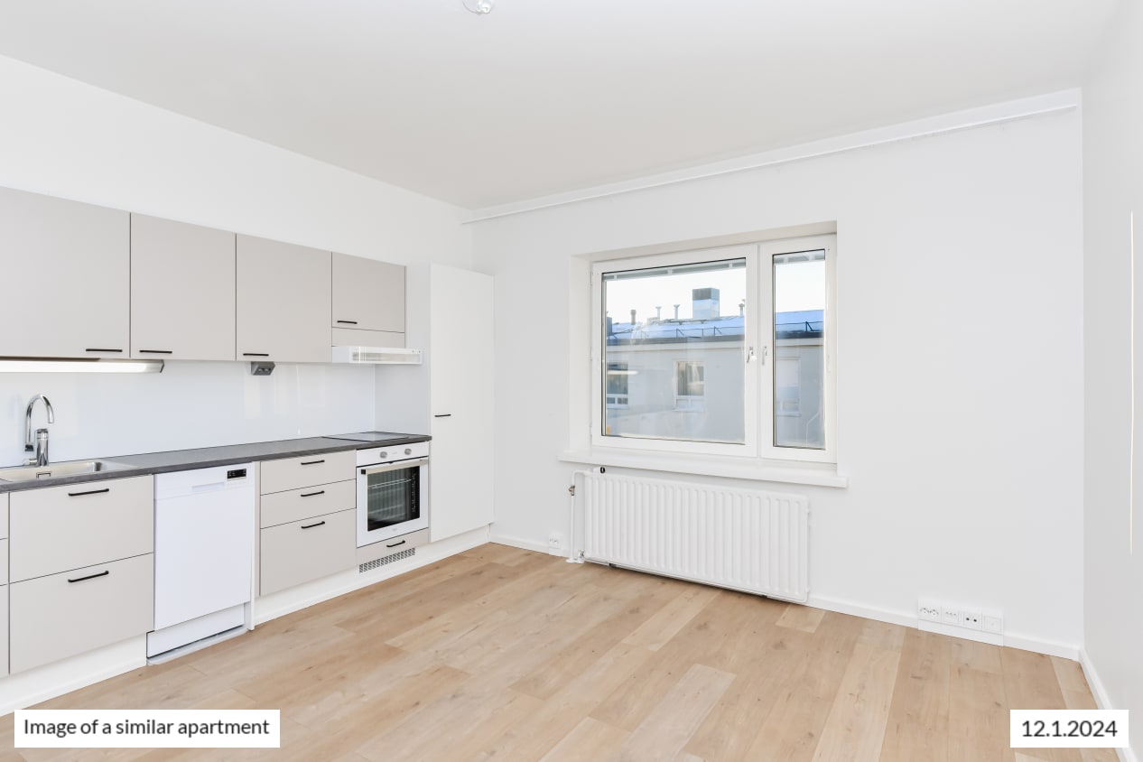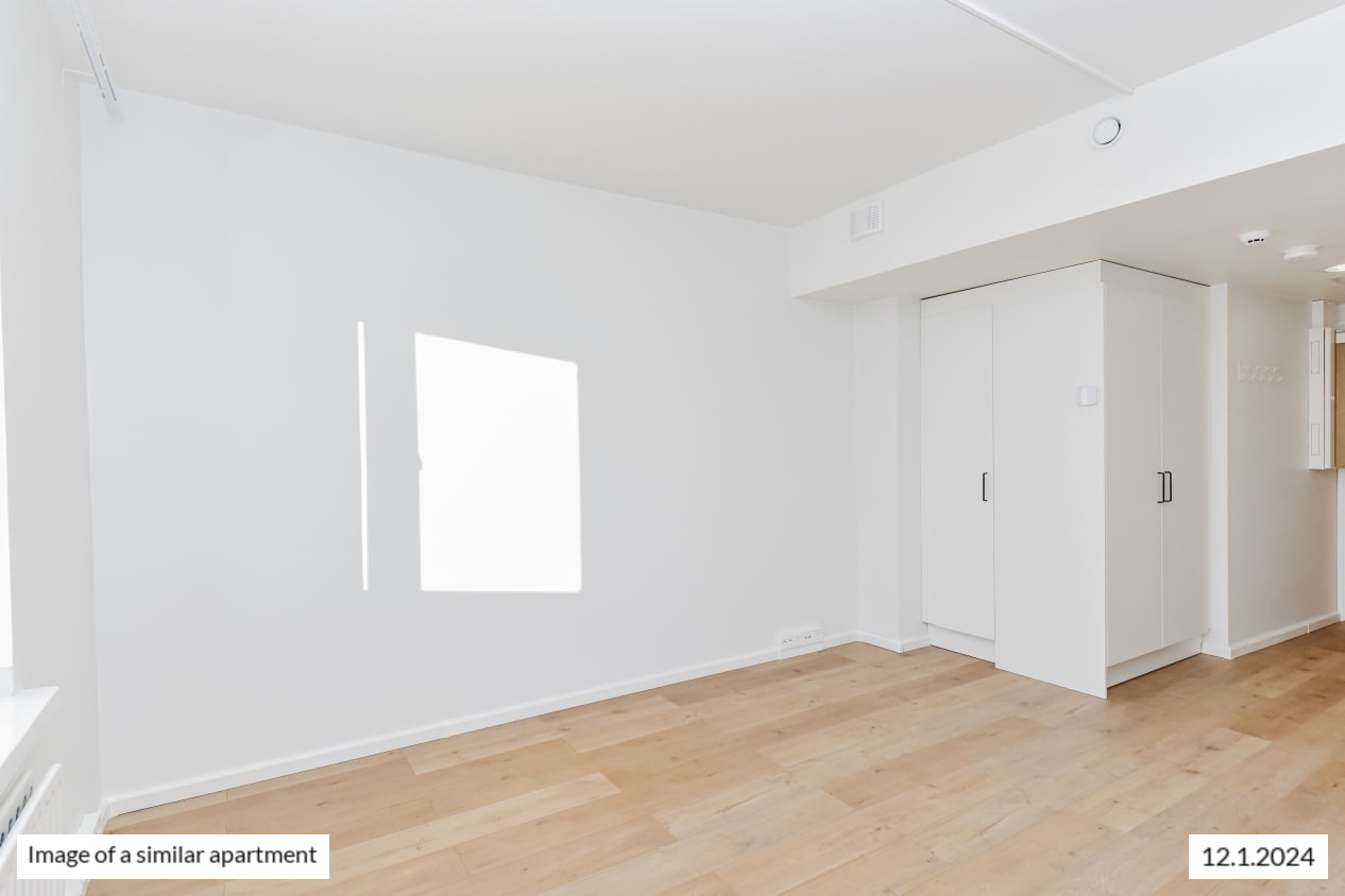 This functional studio home has everything you need and open southwest-facing views towards Hakaniemi. The kitchen space is combined seamlessly with the living area that is easy to furnish just the way you like it. And what would you set on display on the deep, 1950’s windowsills? There is storage space in the entrance hallway as well as the main room. Please notice, that in this apartment the hallway is only 83 cm wide.