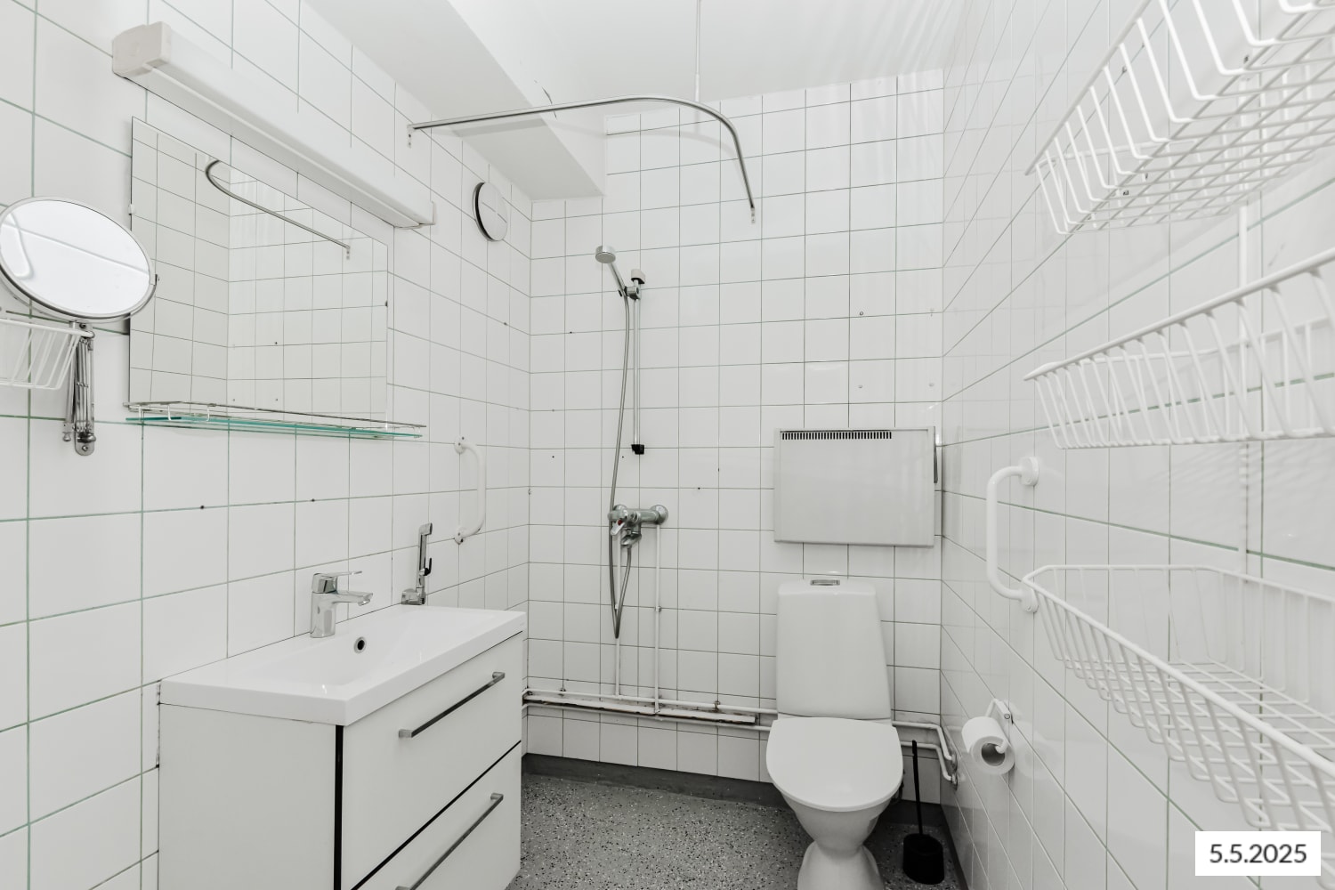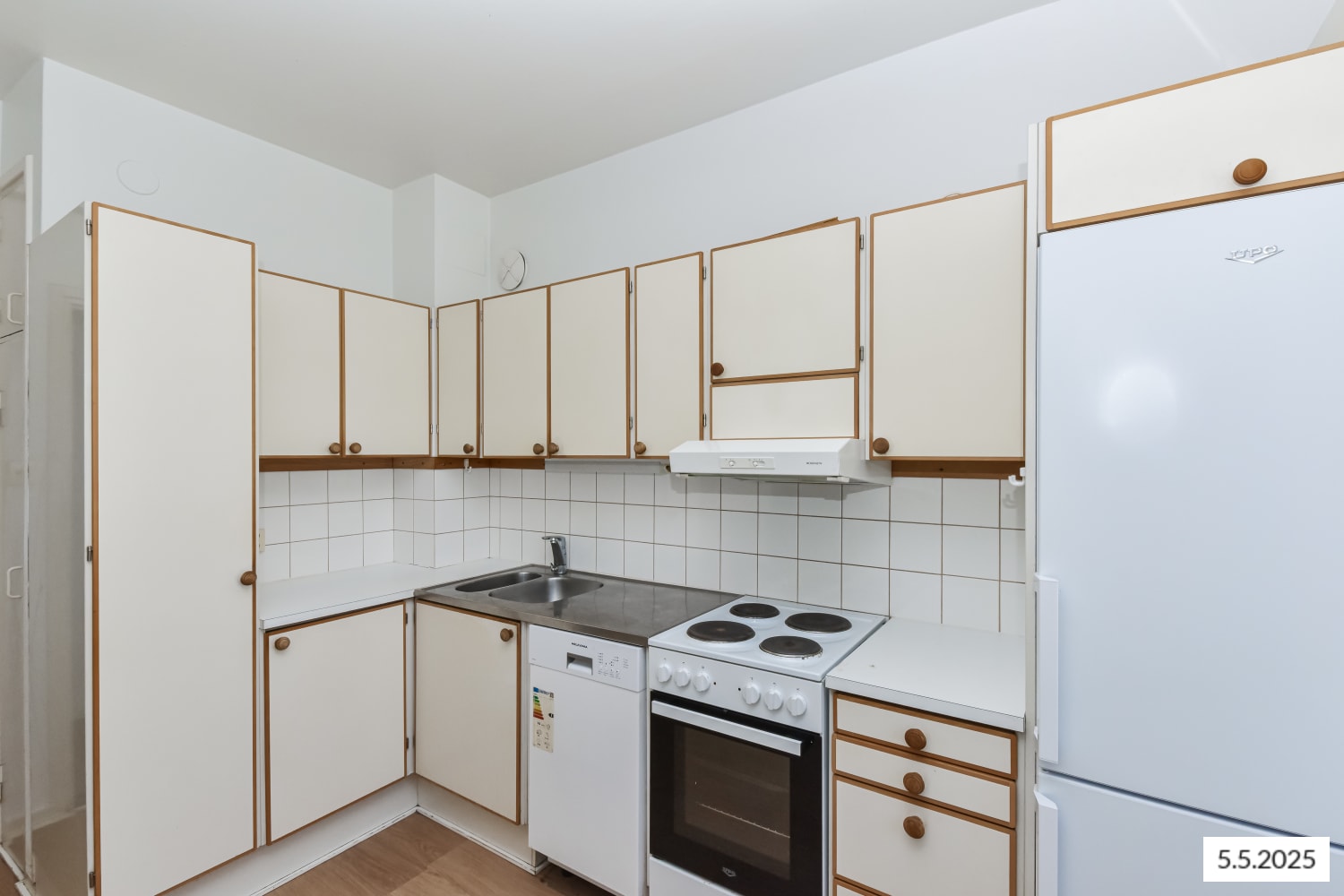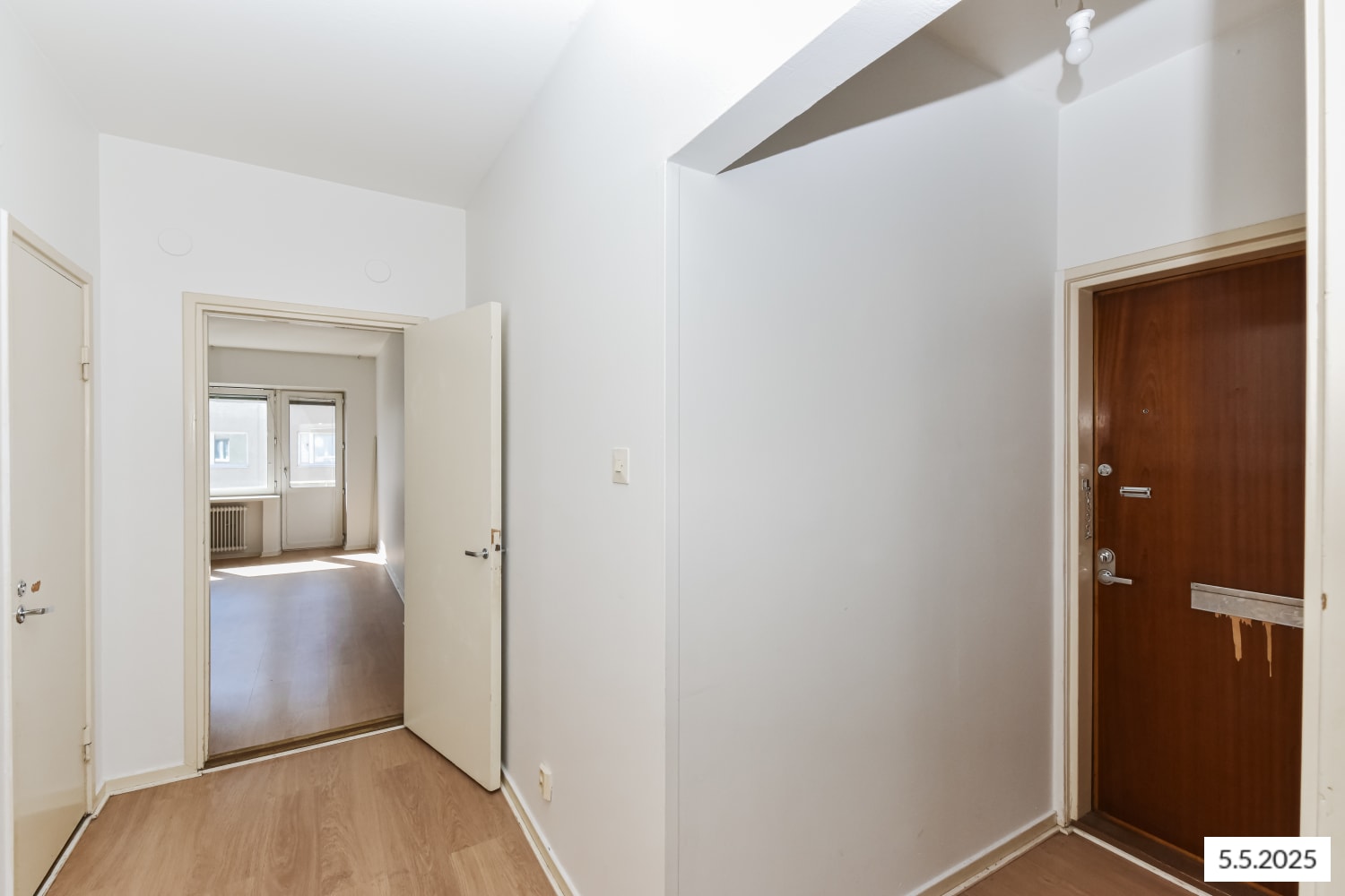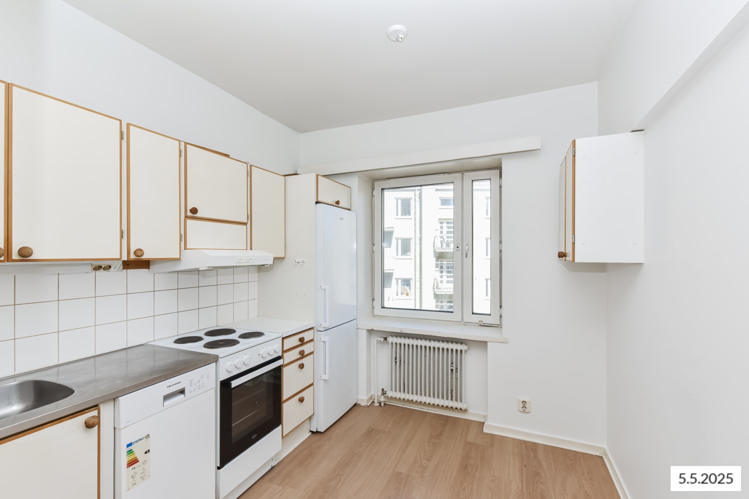 Hämeentie 40 was renovated in 2023 with respect for the 1950s spirit of the building. The building has seven residential storeys and two staircase sections with lifts. Please notice that not all apartments in the building built in 1952 meet modern accessibility requirements. Please note that the surface materials and technical solutions of Hämeentie 42 and 44 differ from these. The interior decor materials, furnishings and fittings of these light-toned homes are beautiful and timeless. The harmonious colour scheme is pleasing to many tastes and the open, clean layouts make it easy to furnish your home to your liking. The apartment floors are done in light brown oak-effect laminate and the walls are painted in white. The kitchen cabinet doors are in beige and the backsplash in white furniture board, while the countertops are in textured grey. The kitchens are equipped with an induction cooktop (with two burners in the studios and one-bedroom homes and four burners in the two-bedroom homes), built-in oven, extractor fan, 40 or 60 cm dishwasher and fridge-freezer. All appliances are white. There is space for a microwave. The kitchen under-sink cabinet is equipped with SATO’s Seth waste unit consisting of coloured waste bins for easy recycling. The bathroom comes with white Kide range furniture designed for SATO. The massive-laminate Kide furniture is made in Finland and has been awarded both the Key Flag and the Design from Finland symbols. The bathroom walls are done in light marble effect tiles, and the floor tiles are grey. The bathrooms come with hookups and space for a washing machine. The apartments have mechanical supply and exhaust ventilation and district heating. The entrance hallways and bathrooms have fixed light fittings.