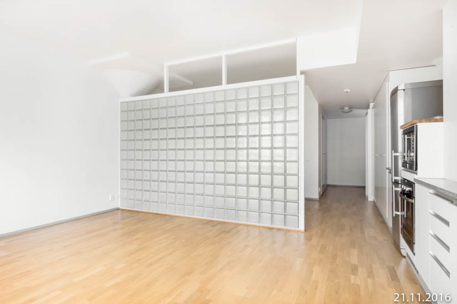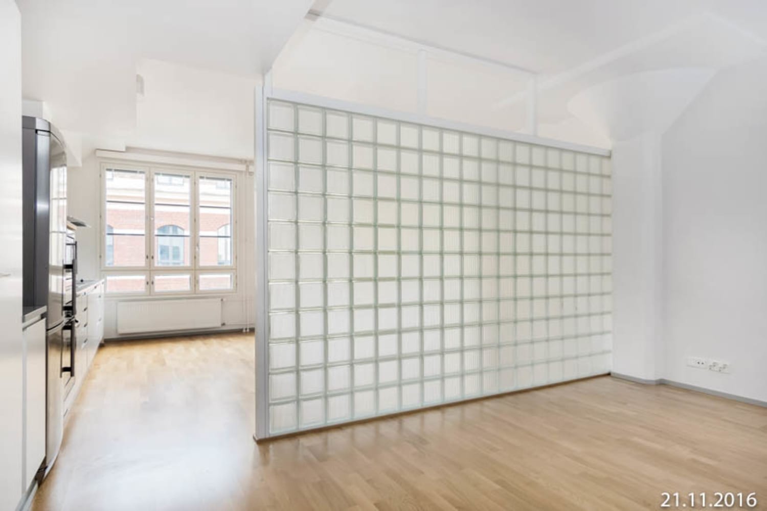 The charming apartment is situated in a courtyard, just a stone's throw from the city centre amenities, yet far from the hustle and bustle. The apartment windows overlook a sheltered playground, and the glass brick wall filtering light into the sleeping area enhances the feeling of space.