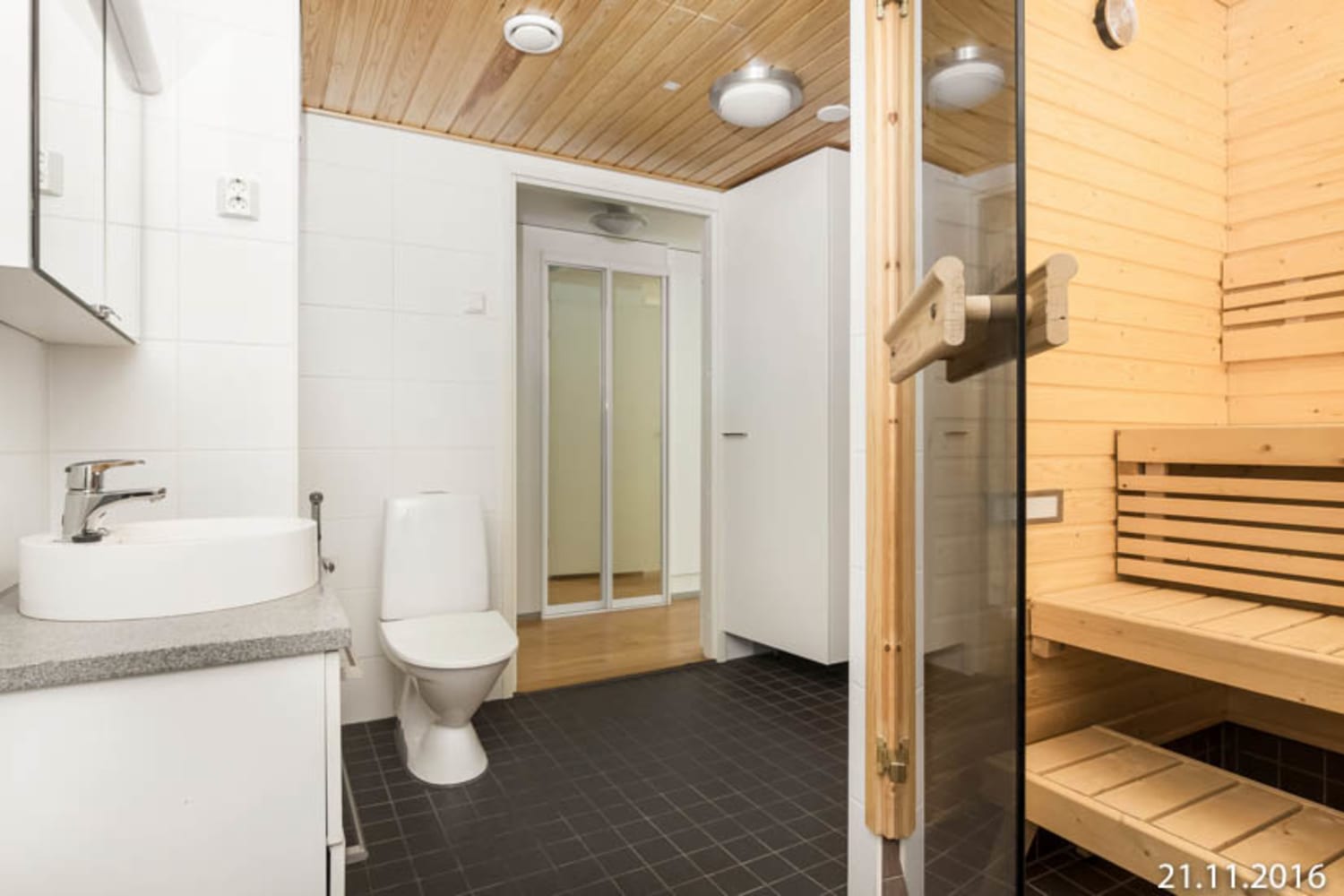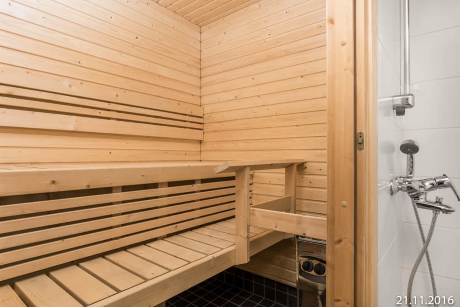 The living room floors are oak parquet. The bathroom features large white wall tiles laid horizontally, a subtle dark brown tile floor, and underfloor heating for comfort. The sauna is made from Finnish spruce. The kitchen cabinets are a sleek white with aluminium handle strips at the bottom. The backsplash is dark grey, and the countertops are beautiful grey-grained granite. The apartment comes equipped with a stainless steel freezer-refrigerator, a built-in ceramic hob and oven, a microwave, and a dishwasher.