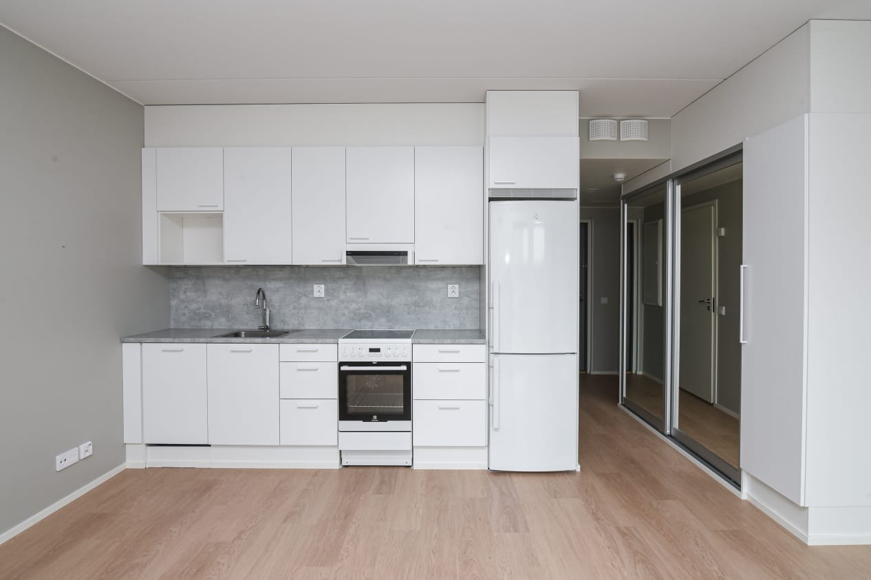 The home's flooring is light oak laminate, and the walls are painted in light grey. The kitchen cabinets are fresh white, and the space between the upper and lower cabinets, as well as the worktop, is grey laminate. The equipment includes a dishwasher, a ceramic hob, and a freezer-refrigerator.