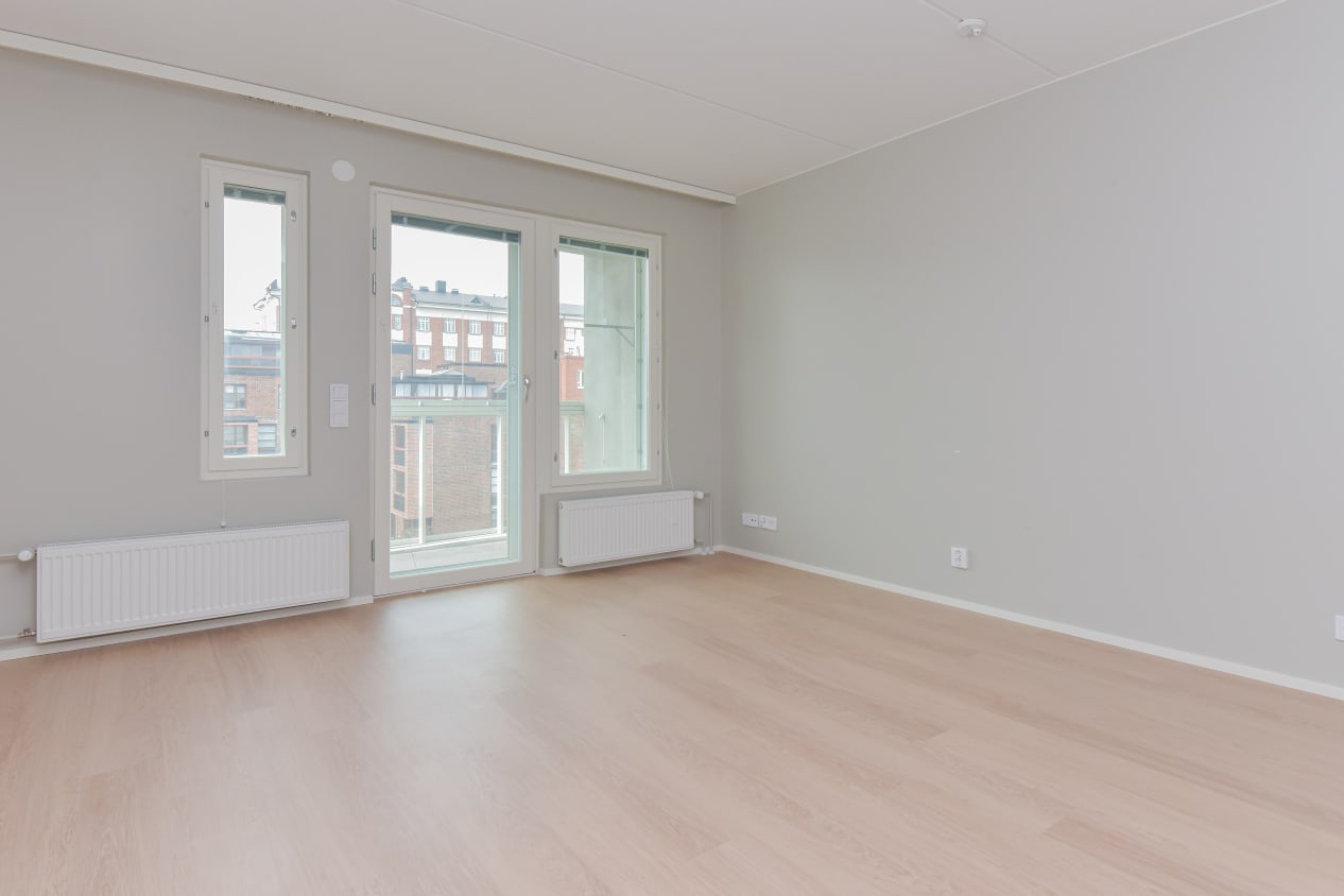 This brand-new studio apartment feels remarkably spacious for its size and is easy to furnish into a comfortable home. The glazed balcony, facing the sheltered courtyard, offers a cozy spot to enjoy summer evenings. The apartment features light oak laminate flooring and soft grey-painted walls. The kitchen cabinets are fresh white, complemented by grey laminate countertops and backsplash. Appliances include a dishwasher, ceramic hob, and fridge-freezer.