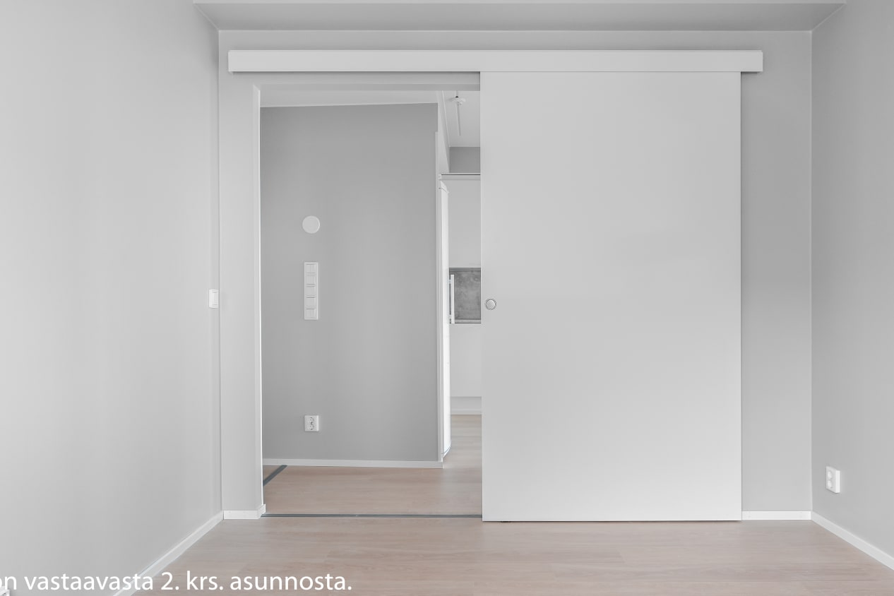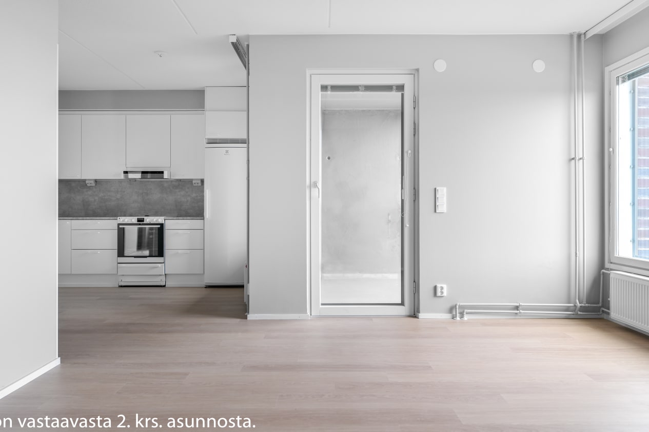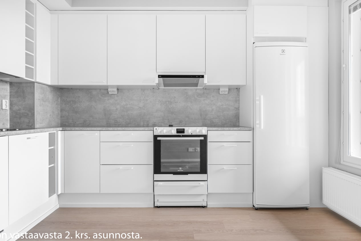 The home's floor is light oak laminate and the walls are painted in light grey. The open kitchen has space for cooking and accommodates a proper dining table. The kitchen cabinets are crisp white, and the space between the upper and lower cabinets, as well as the worktop, are grey laminate. The equipment includes a dishwasher, ceramic hob, and a tall refrigerator and freezer.