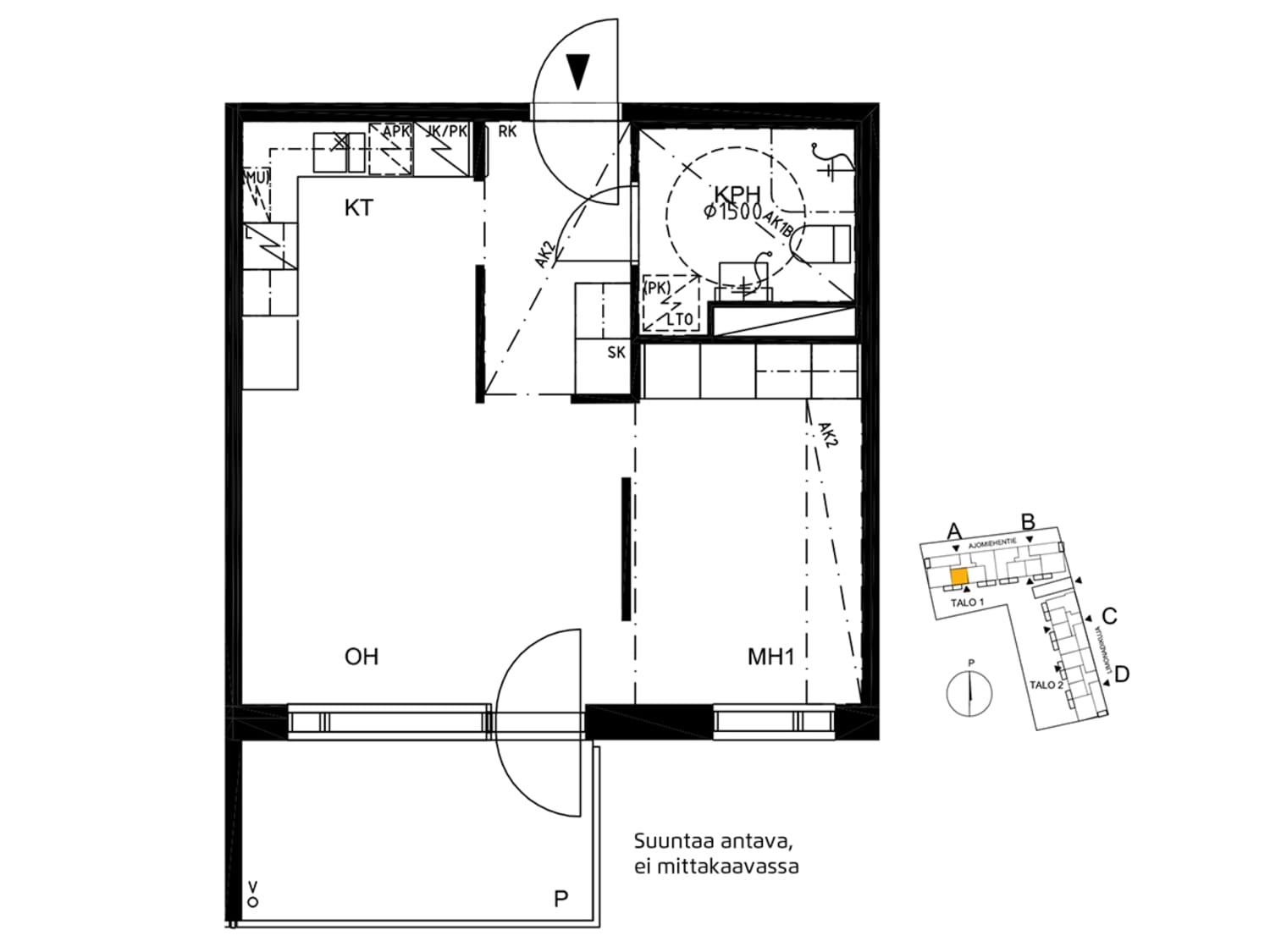 Located at the corner of Ajomiehentie and Limonadikuja streets are two apartment buildings with three to six storeys. The apartment layouts are clean and spacious, and the kitchens open to the living areas. The kitchen units are white and worktops in dark wood-effect laminate. There is space and hookups for a washing machine in the spacious bathrooms.