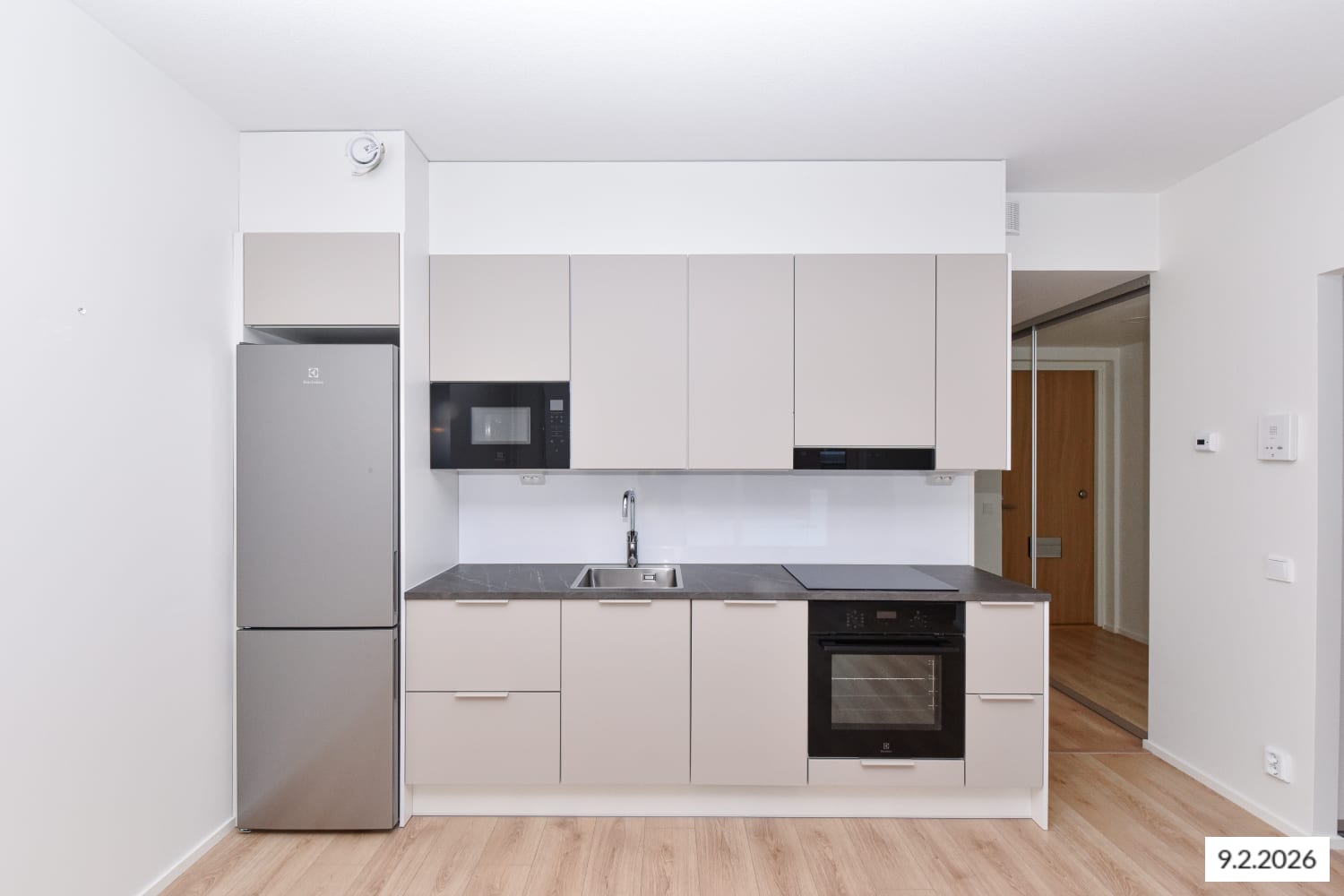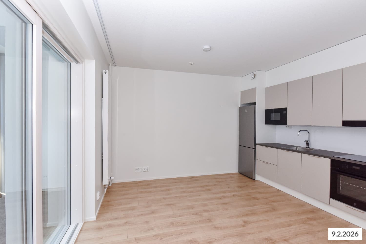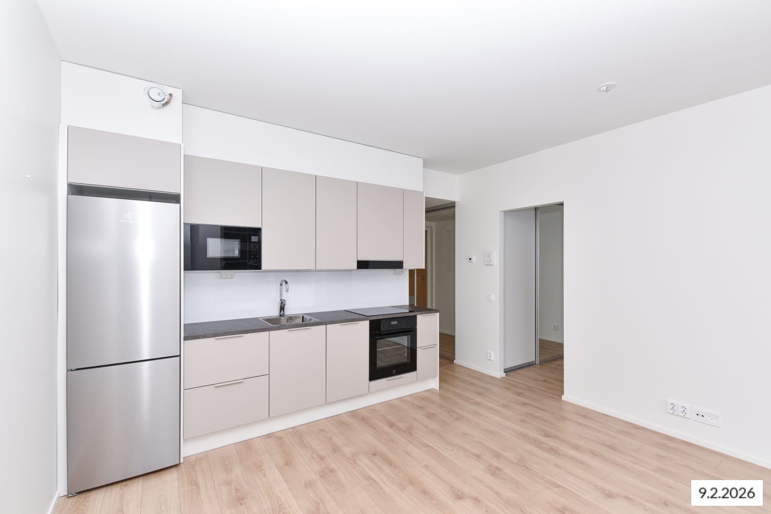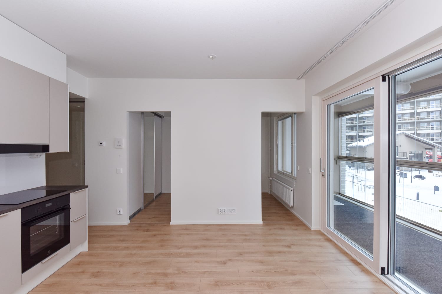 This second-floor one-bedroom flat is designed for efficient use of space, with a layout that maximises every square metre. The kitchen and living area form a seamless open space, while sliding doors reveal a quiet sleeping nook with built-in wardrobes. The cosy Puustelli kitchen, the heart of this home, is fully equipped with high-quality appliances, including an induction hob and dishwasher. The versatile layout makes furnishing easy and adaptable to your style. A full-width, glassed-in balcony faces east towards the inner courtyard, extending the living area in the summer.