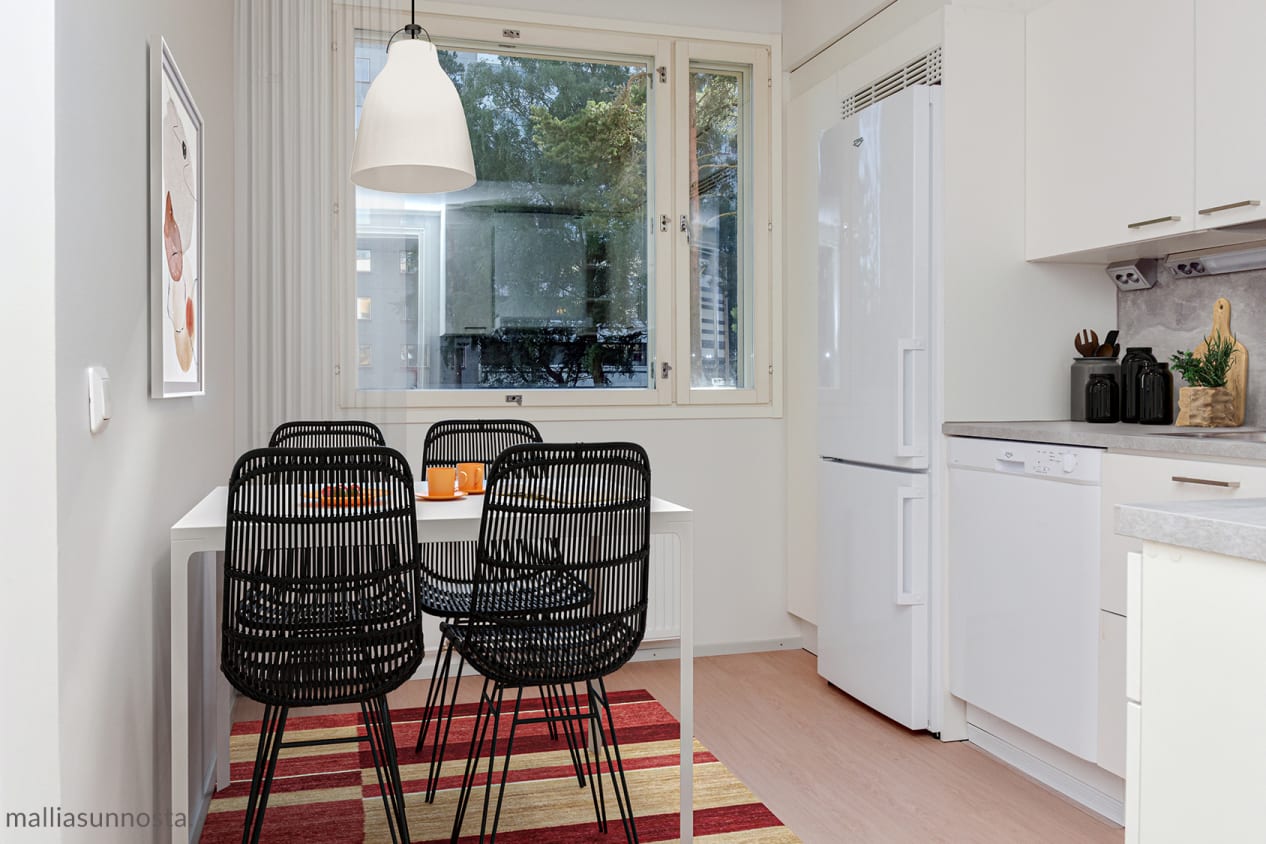 In the separate kitchen, the home cook has plenty of space to work, and there is room for a proper dining table. The kitchen cabinets are fresh white, with grey laminate between the upper and lower cabinets and on the worktop. The equipment includes a ceramic hob, extractor hood, freezer-refrigerator and dishwasher. The appliances are white.