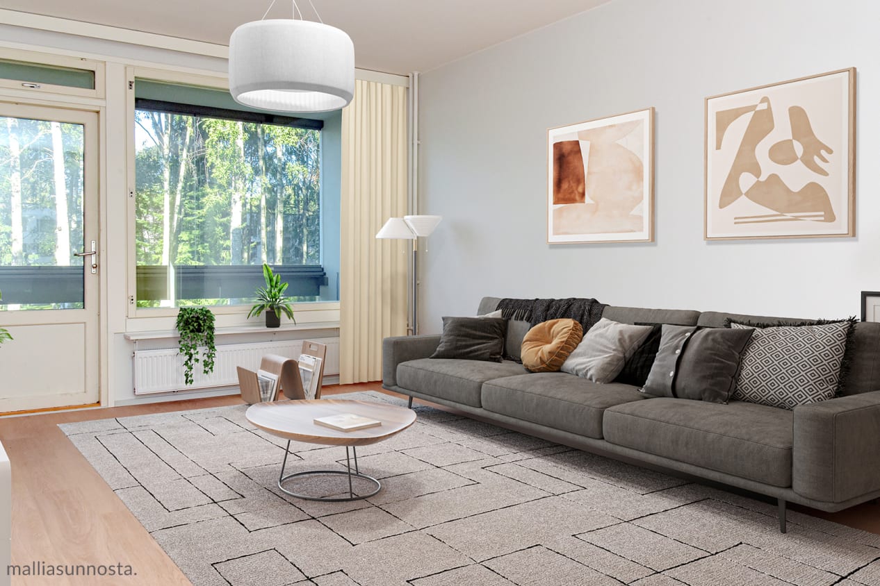 The windows in this renovated, well-designed two-bedroom home open in two directions, bringing natural light into the interior. The flooring is light oak laminate and the walls are painted white. The living room is spacious and easy to decorate according to personal taste. The sheltered, glazed balcony opens towards the evening sun.