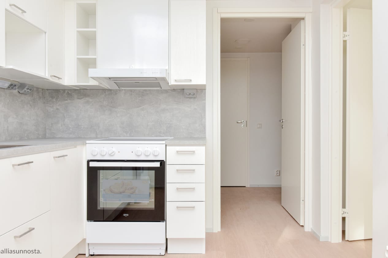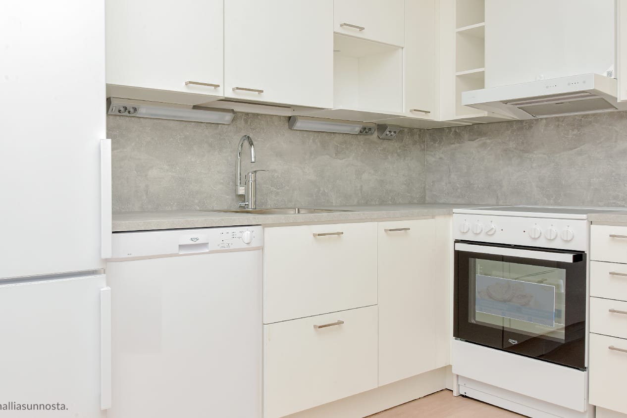 The interior materials of the apartments are light-colored and timeless. The floors are light oak laminate and the walls are painted white. The kitchen units have white cabinets. The space between the top and bottom cabinets and the worktop are gray laminate. In the 1-3-bedroom apartments, the equipment includes a ceramic hob, cooker hood, fridge-freezer and dishwasher. The studios have a ceramic hob and cooker hood and a fridge. Kitchen appliances are white. The furniture in the bathroom is from SATO's Kide collection. Their material is a very durable and beautiful white solid laminate. The bathroom walls are white tile and the floor tiling is gray.