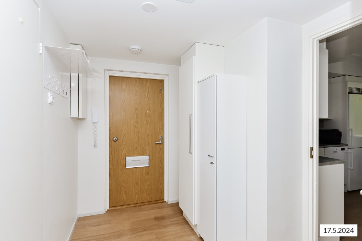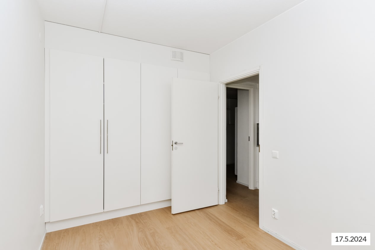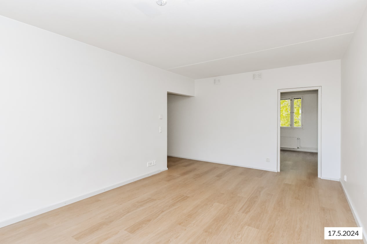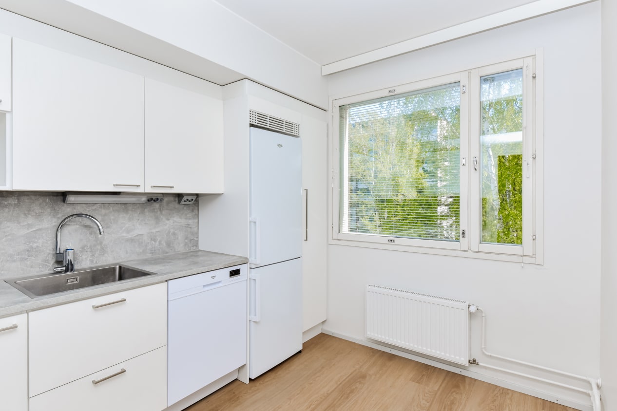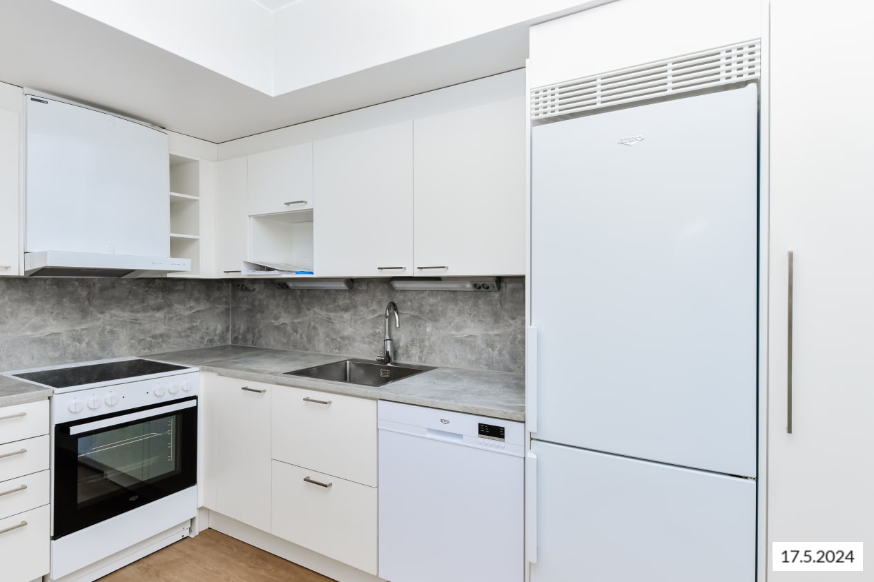 The floor is light oak laminate and the walls are painted white. In the separate kitchen, the home cook has ample space to work, and there's room for a proper dining table. The kitchen cabinets are fresh white, while the space between the upper and lower cabinets and the worktop are grey laminate. The equipment includes a ceramic hob, extractor hood, freezer-refrigerator, and dishwasher. The appliances are white.