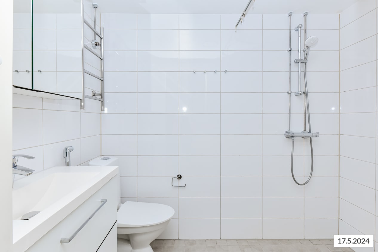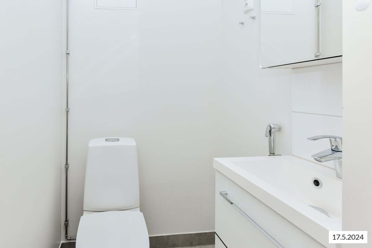 The bathroom and separate toilet feature white SATO's Kide collection furniture. The walls are white tiles, and the floor is grey. There is a designated space for a washing machine in the bathroom.