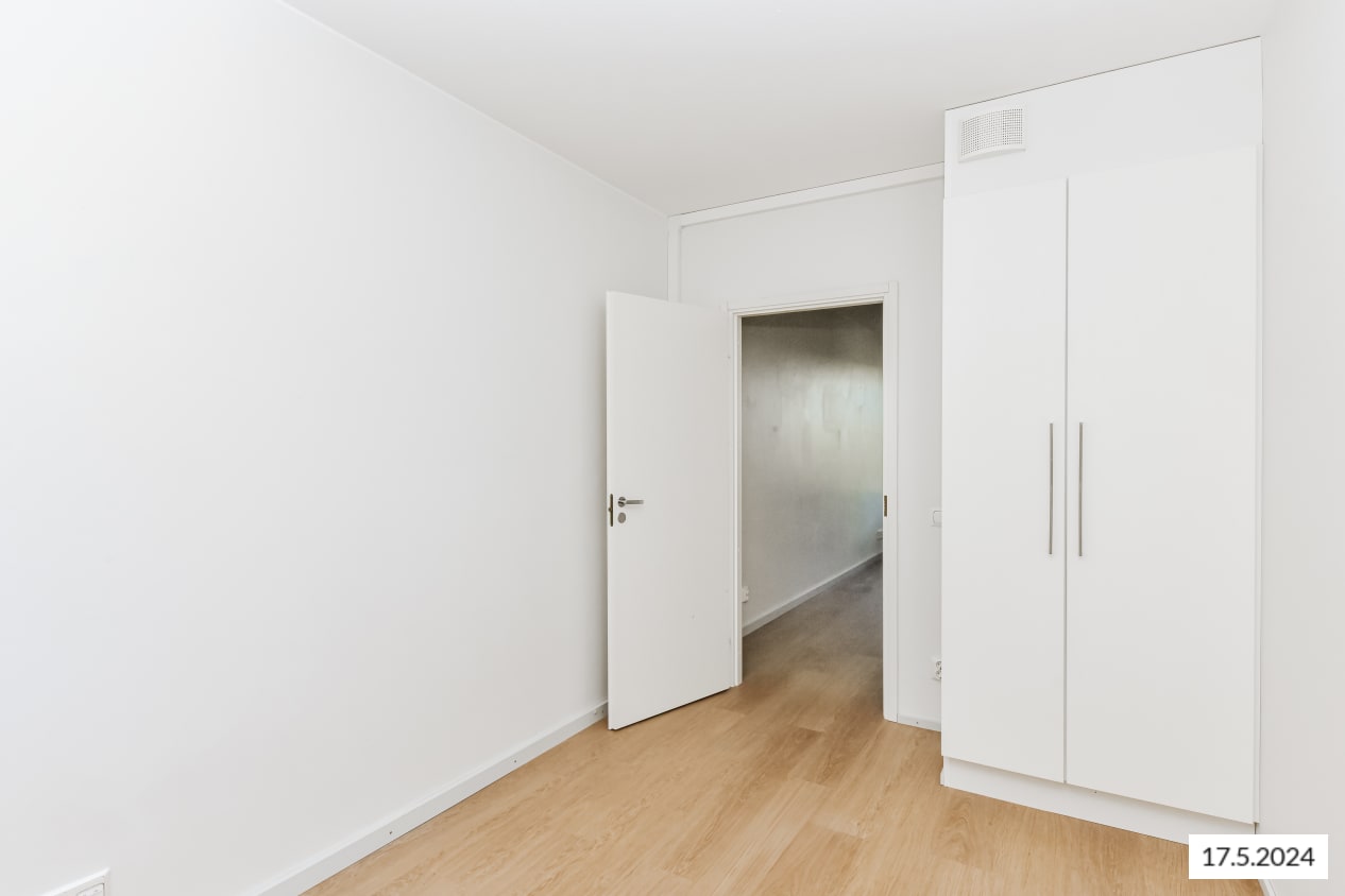 This renovated, generously-sized two-bedroom home features windows opening in two directions, bringing natural light into the interior. The bedroom is exceptionally spacious, offering possibilities for various interior design solutions. The sheltered, glazed balcony faces the evening sun.