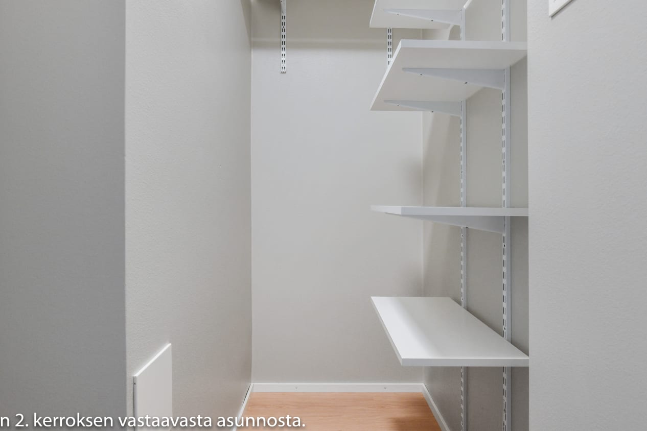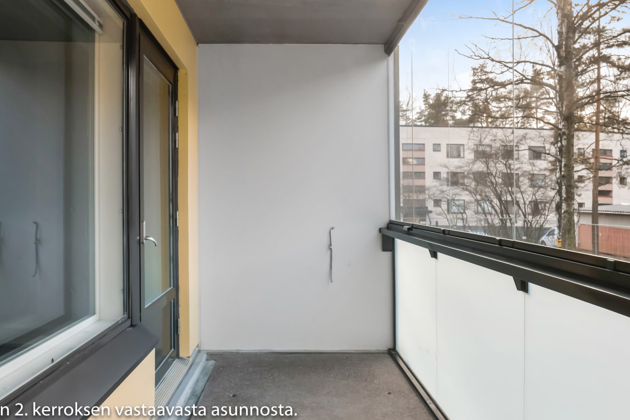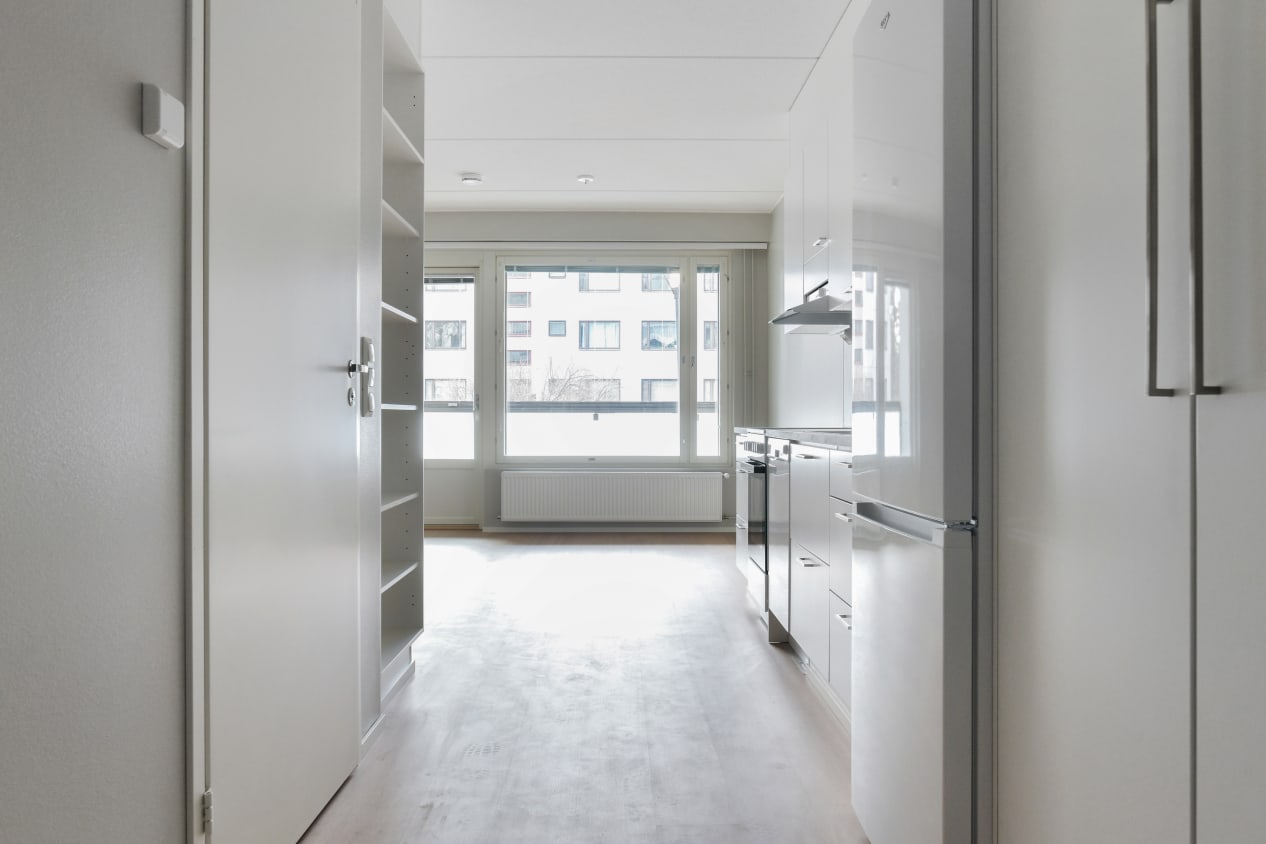 Kaarenjalka 5a is an 8-storey building with its white brick tile facades and strip-like windows being an excellent match to the overall look of the neighbourhood. The building has 56 rental homes from efficient studios and 1-bedroom homes to 3-bedroom apartments with a private sauna. The glassed-in balconies and carefully considered floor plans create a sense of space and airiness in all of the homes. There is a storage space at the entrance to all apartments, providing handy storage for items such as sports and leisure equipment. The building’s shared sauna section with a terrace for cooling down, the laundry and drying room as well as the outdoor equipment and apartment-specific storage units are located on Floor 1. There is also a separate storage building for bicycles on the grounds.