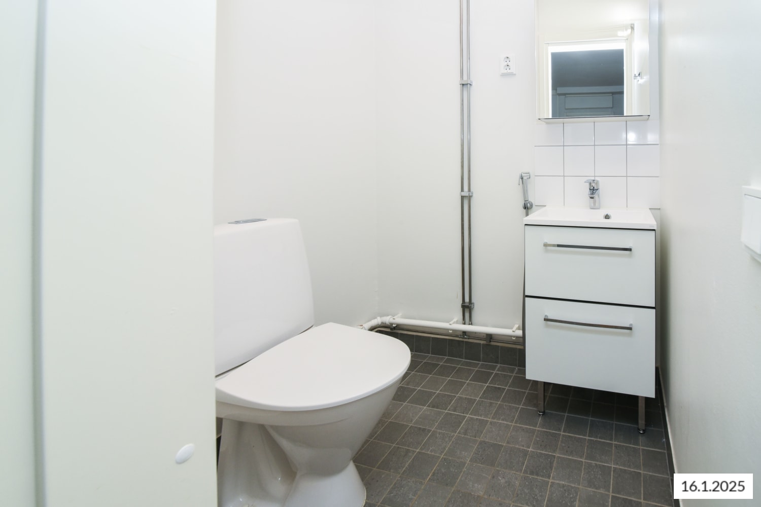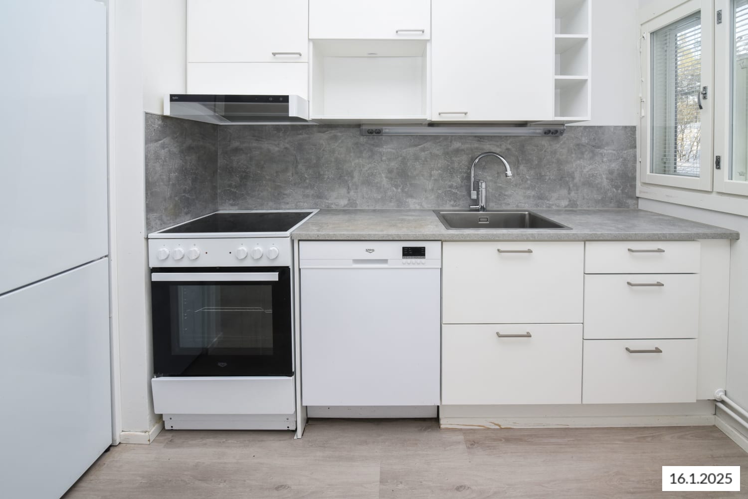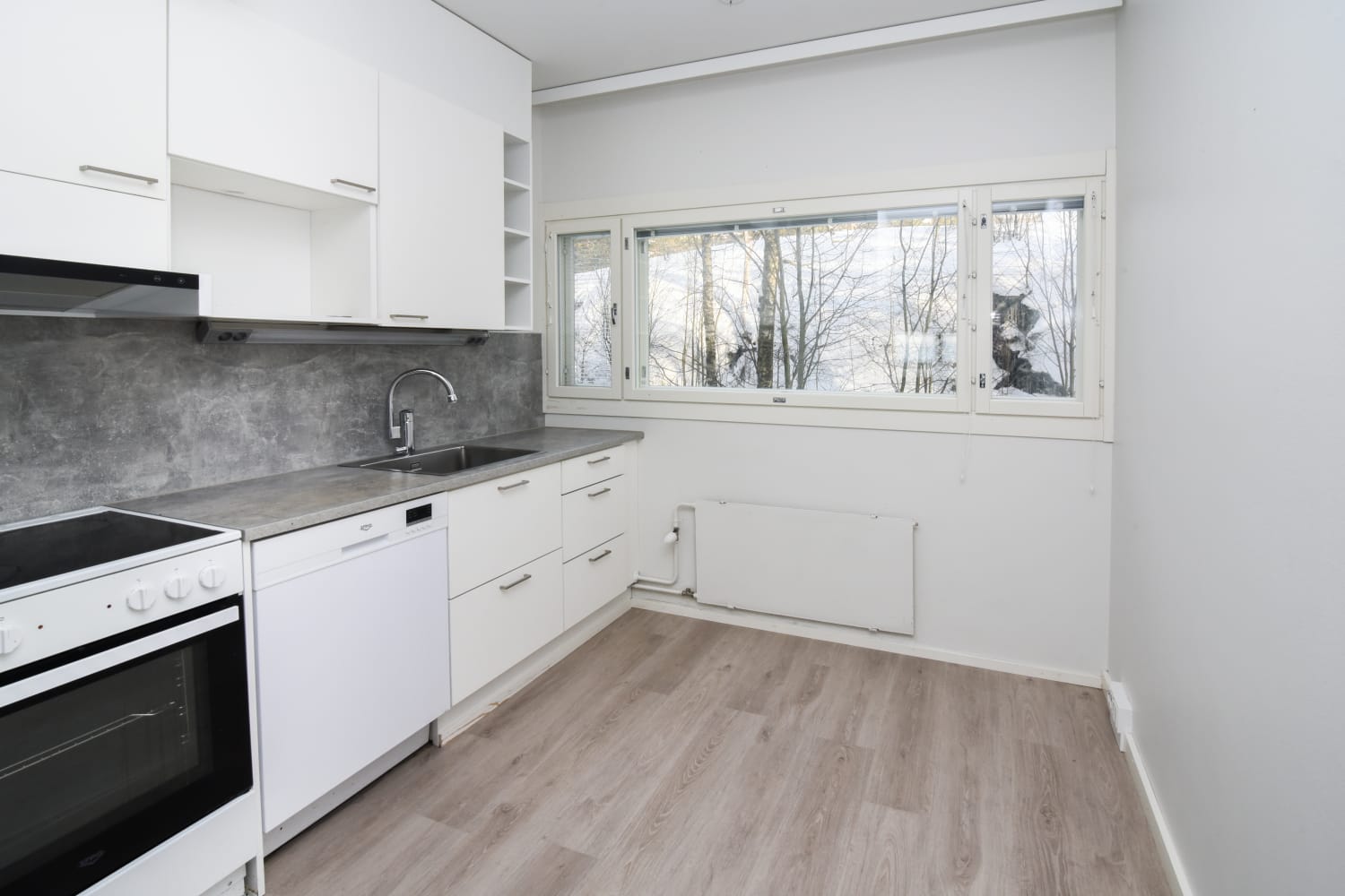 The interior materials of the apartments are light-colored and timeless. The floors are oak laminate and the walls are painted white. The kitchen units have white cabinets. The space between the top and bottom cabinets and the worktop are grey laminate. In the 1-3-bedroom apartments, the equipment includes a ceramic hob, cooker hood, fridge-freezer and dishwasher. Kitchen appliances are white. The furniture in the bathroom is from SATO's Kide collection. Their material is a very durable and beautiful white solid laminate. The bathroom walls are white tile and the floor tiling is gray.