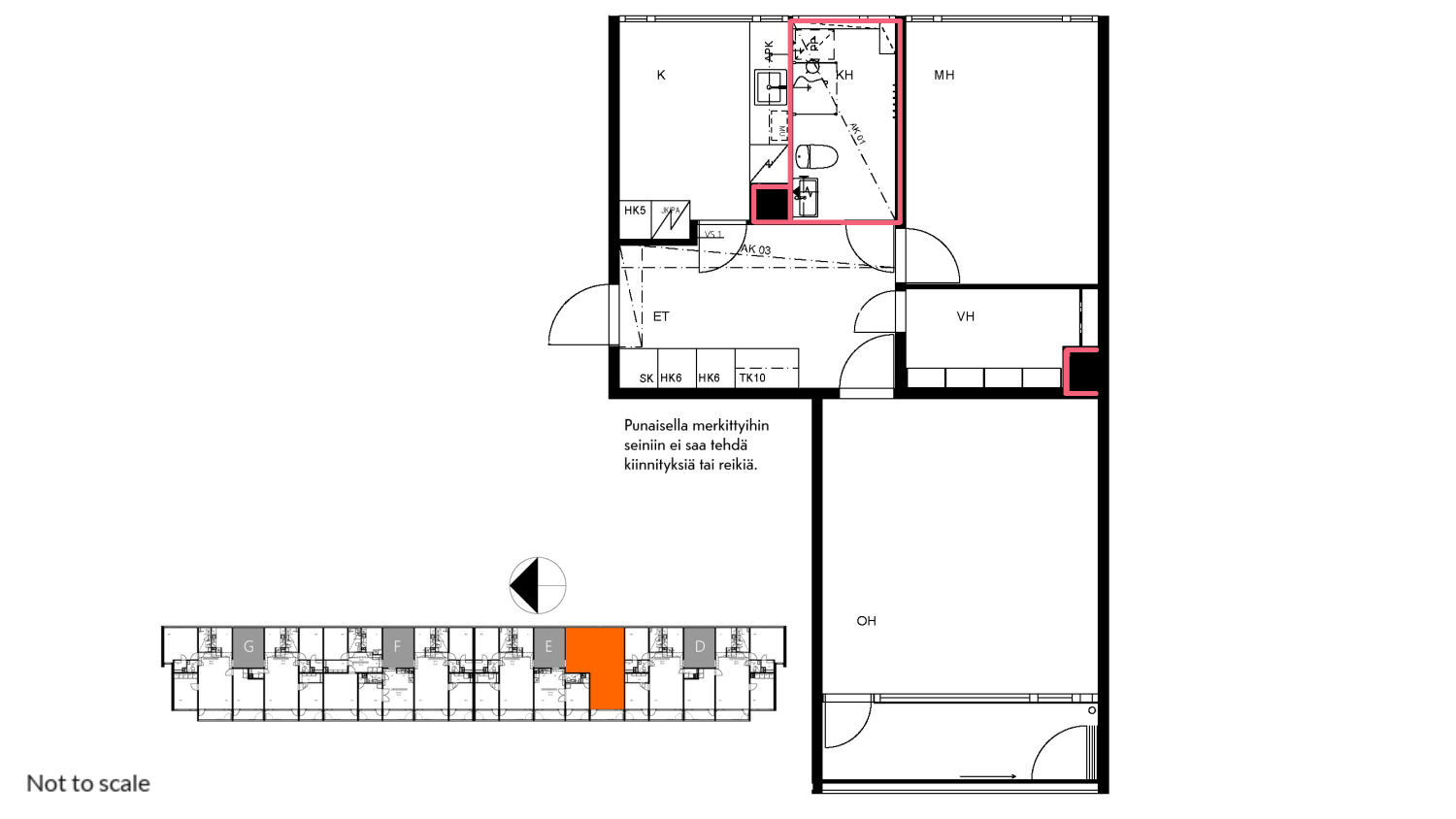 The interior materials of the apartments are light-colored and timeless. The floors are oak laminate and the walls are painted white. The kitchen units have white cabinets. The space between the top and bottom cabinets and the worktop are grey laminate. In the 1-3-bedroom apartments, the equipment includes a ceramic hob, cooker hood, fridge-freezer and dishwasher. Kitchen appliances are white. The furniture in the bathroom is from SATO's Kide collection. Their material is a very durable and beautiful white solid laminate. The bathroom walls are white tile and the floor tiling is gray.