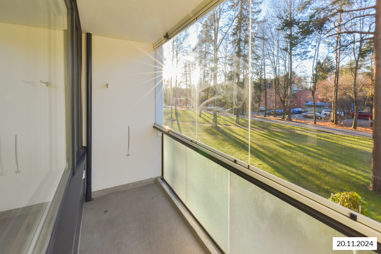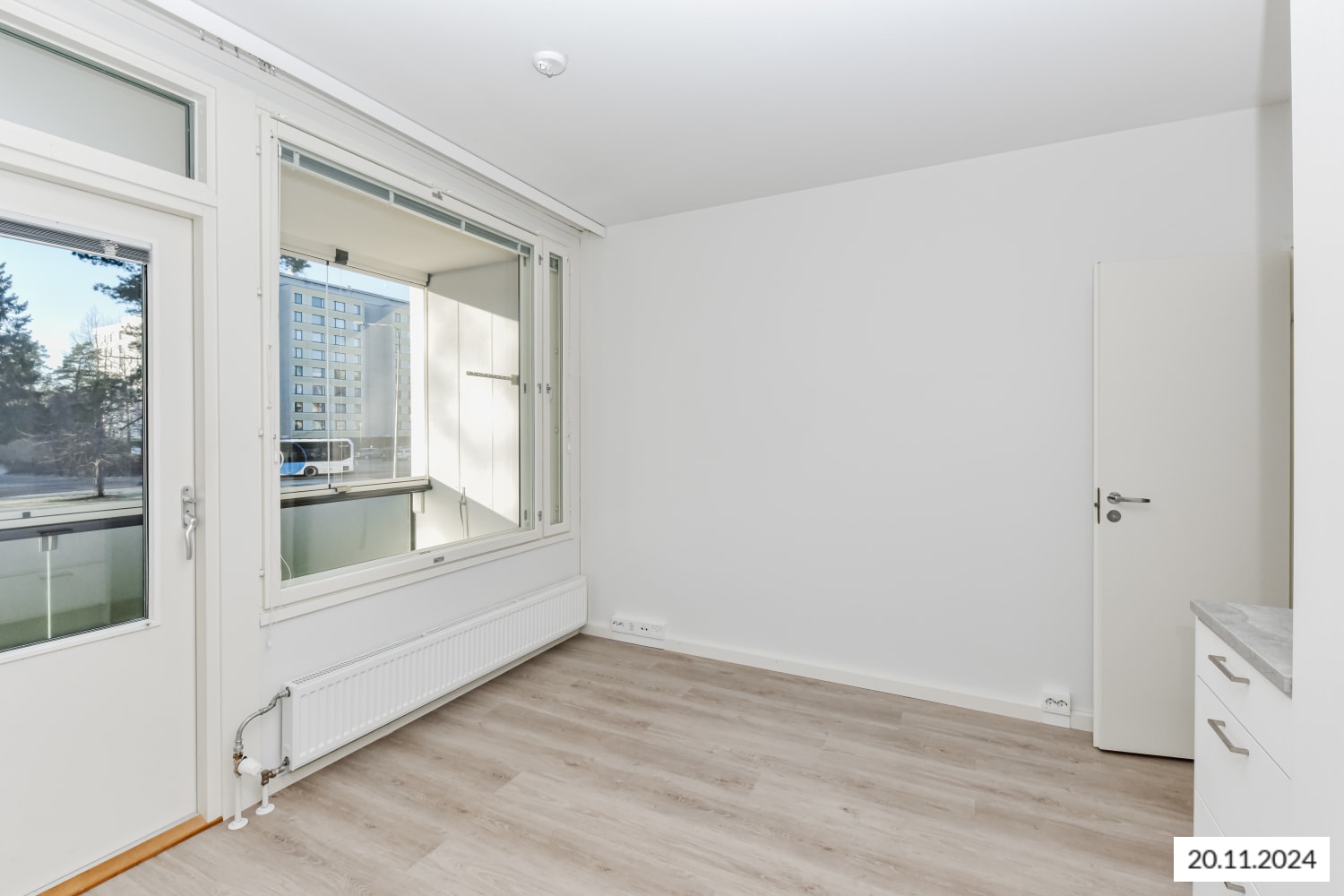 This renovated one-bedroom home, with a clear layout solution, can be easily furnished to become your own home. The living room and open kitchen combine to form a bright living area that extends to a glazed balcony facing the evening sun. The bedroom, accessed through double doors, features a walk-in wardrobe and another balcony. The home's surface materials are light and minimalistic. The flooring is light oak laminate, and the walls are painted white. The streamlined open kitchen cupboards are white. The space between the upper and lower cupboards and the worktop are grey laminate. The kitchen is equipped with a ceramic hob, extractor hood, dishwasher, and freezer-refrigerator. The appliances are white. The bathroom has white furniture from SATO's Kide collection. The walls are white tiles and the floor is grey. There is no space for a washing machine in the bathroom, but you have access to the communal laundry room and drying room.