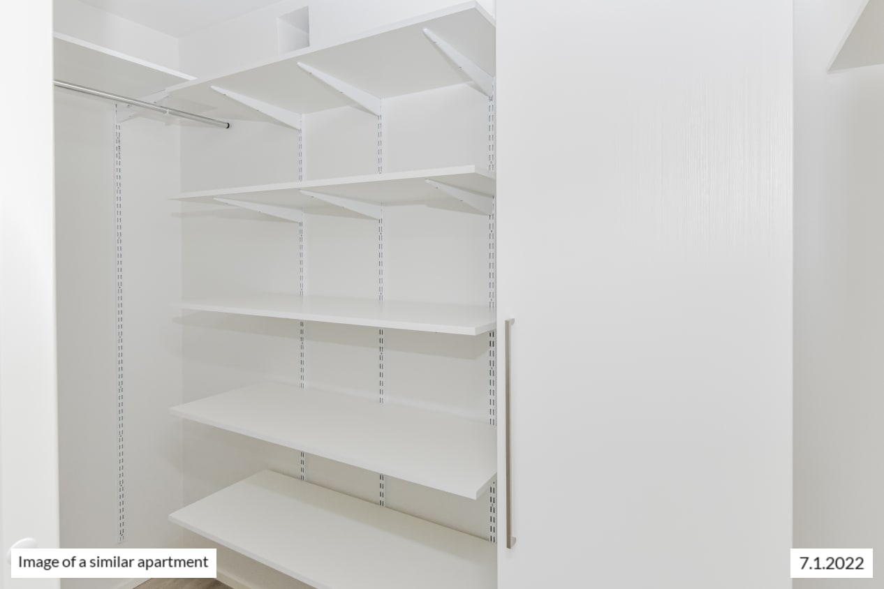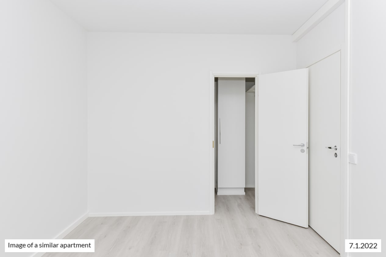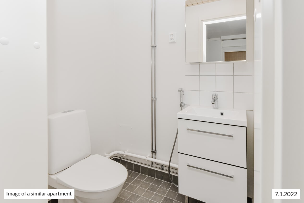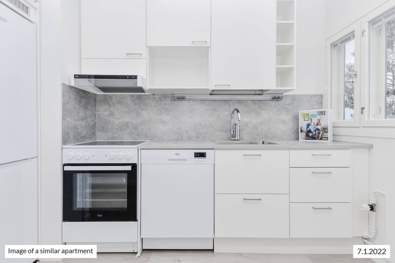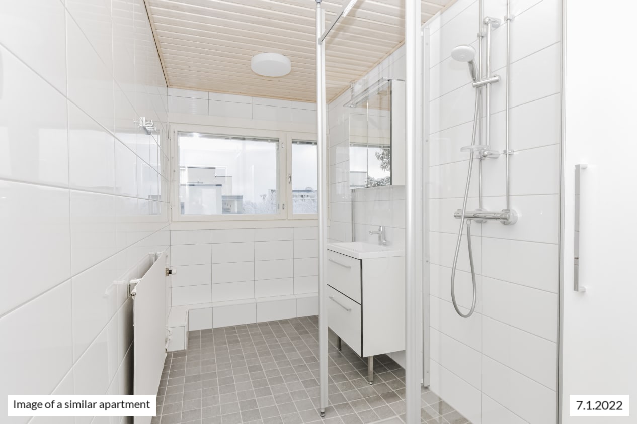 The interior materials of the apartments are light-colored and timeless. The floors are oak laminate and the walls are painted white. The kitchen units have white cabinets. The space between the top and bottom cabinets and the worktop are grey laminate. In the 1-3-bedroom apartments, the equipment includes a ceramic hob, cooker hood, fridge-freezer and dishwasher. Kitchen appliances are white. The furniture in the bathroom is from SATO's Kide collection. Their material is a very durable and beautiful white solid laminate. The bathroom walls are white tile and the floor tiling is gray.