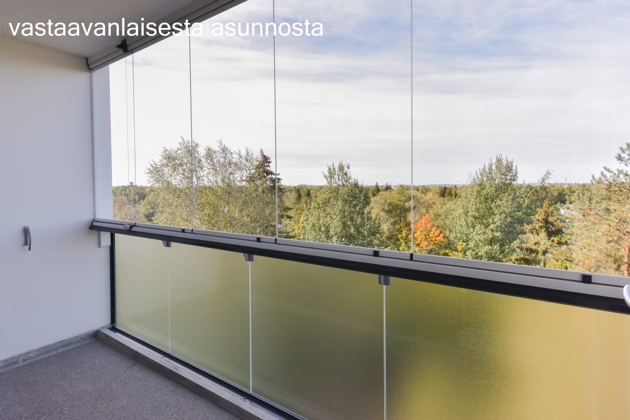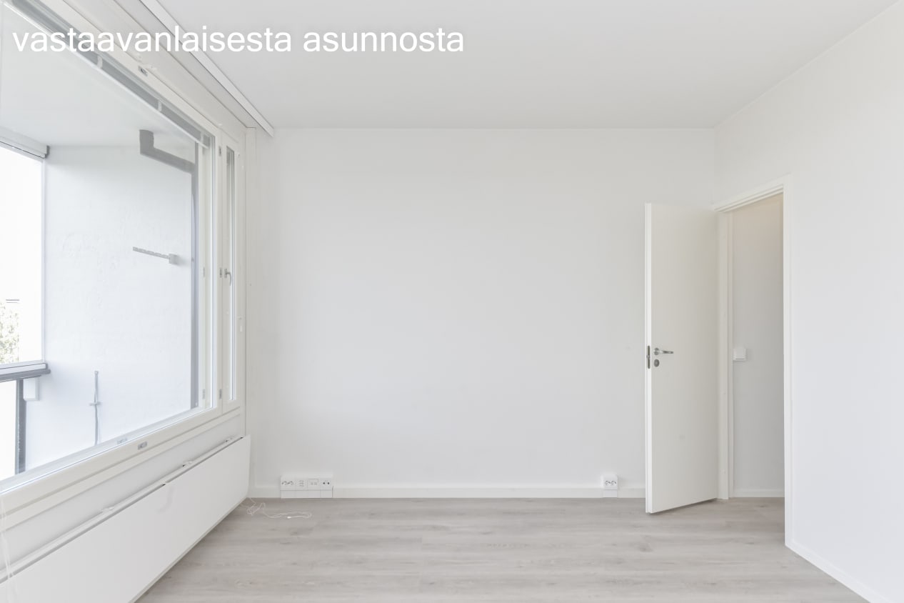 This renovated one-bedroom home, equipped with a clear spatial solution, is easily furnished into your own personal space. The living room and open kitchen combine into a bright living area, which extends to a glazed balcony facing the evening sun. The bedroom, accessed through double doors, includes a walk-in wardrobe and another balcony. The home features light and minimalist materials. The flooring is light oak laminate, and the walls are painted white. The sleek open kitchen has white cabinets. The space between the upper and lower cabinets and the worktop are grey laminate. The kitchen includes a ceramic hob, extractor hood, dishwasher, and freezer-refrigerator. The appliances are white. The bathroom has white furnishings from SATO's Kide collection. The walls are white tiles, and the floor is grey. While there is no space for a washing machine in the bathroom, you have access to the building's laundry room and drying room.