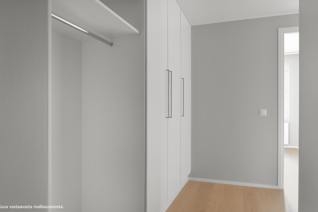 Keinulaudantie 7a is an 8-storey building with its white brick tile facades and strip-like windows being an excellent match to the overall look of the neighbourhood. The building has 56 rental homes from efficient studios and 1-bedroom homes to 3-bedroom apartments with a private sauna. The glassed-in balconies and carefully considered floor plans create a sense of space and airiness in all of the homes. There is a storage space at the entrance to all apartments, providing handy storage for items such as sports and leisure equipment. The building’s shared sauna section with a terrace for cooling down, the laundry and drying room as well as the outdoor equipment and apartment-specific storage units are located on Floor 1. There is also a separate storage building for bicycles on the grounds.